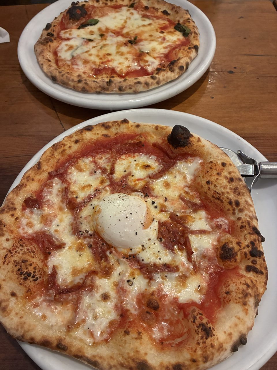 おすすめピザの半熟玉子とベーコンのピッツァ「ビスマルク」(半熟玉子・ベーコン・トマトソース・モッツァレラ)とコーラのセットを注文!