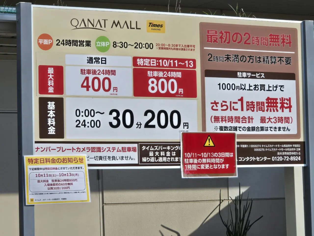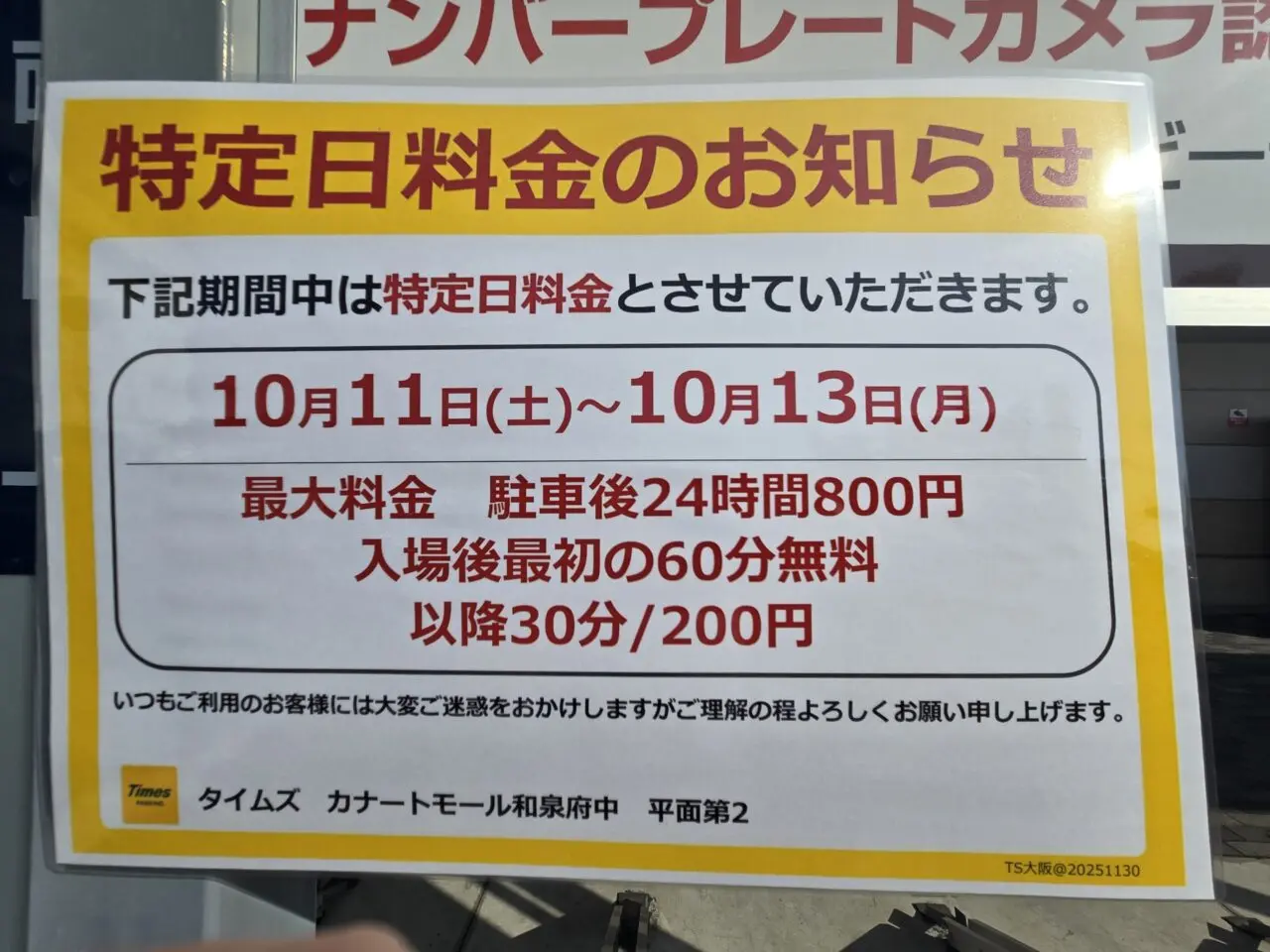 カナートモール和泉府中では2025年10月11日(土曜日)~13日(月曜日・祝日)の期間、駐車場料金の内容が一部変更となります。
