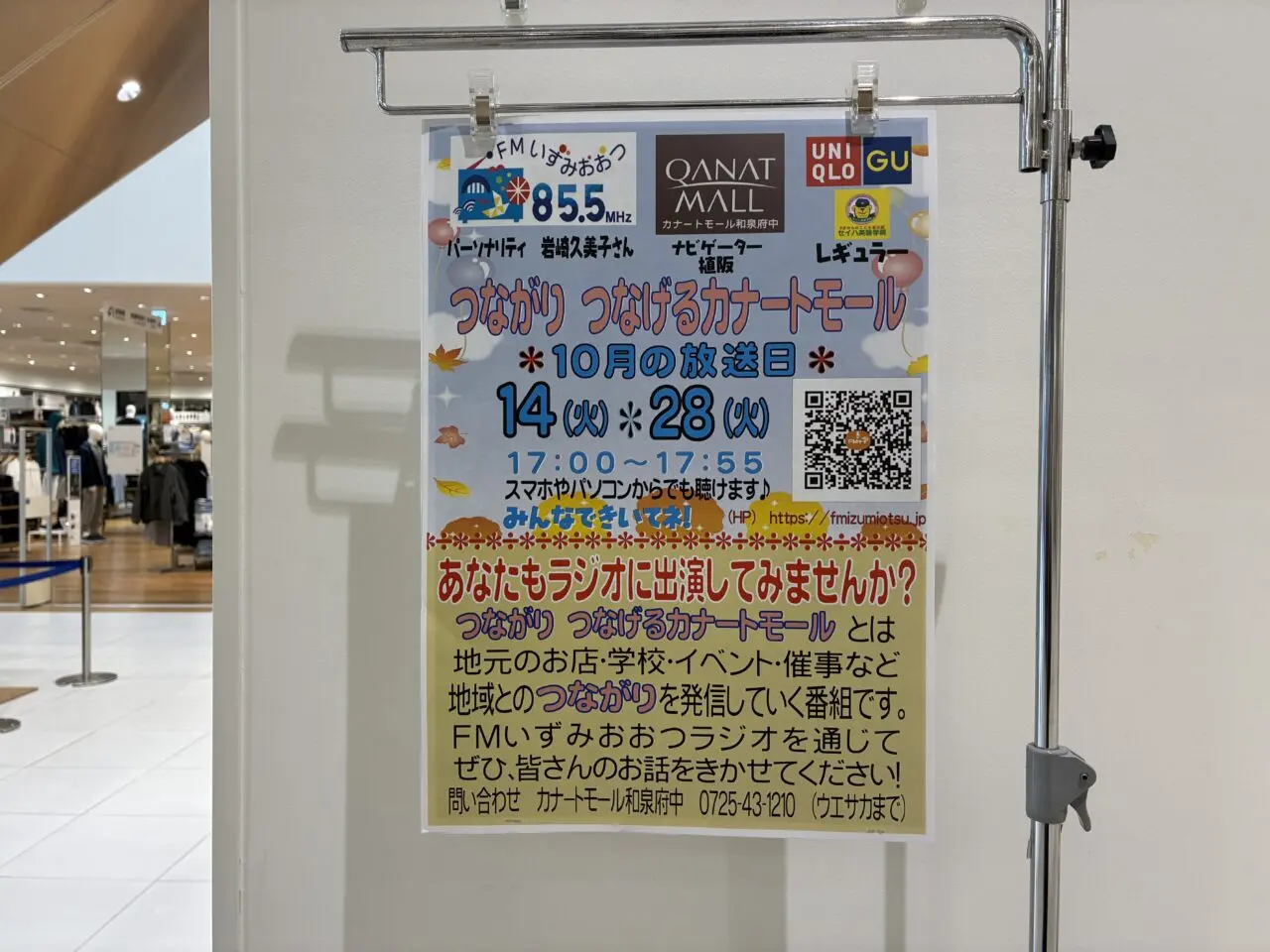 尚、カナートモール和泉府中では月2回fmいずみおおつの番組「つながりつながるカナートモール」でカナートモール和泉府中のイベントや催事・地元の情報を発信されています。