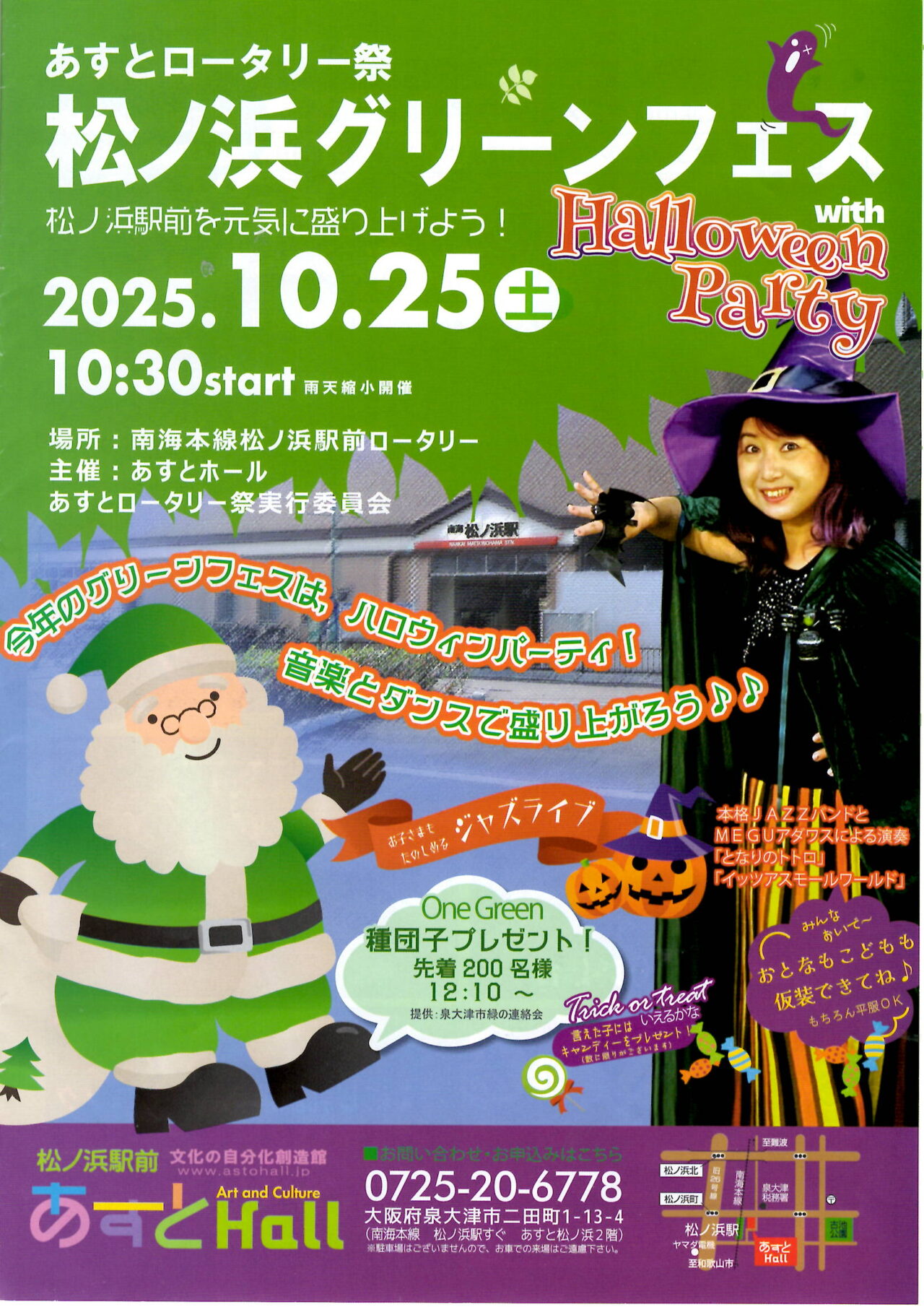 2025年10月25日(土)10時半より南海本線松ノ浜駅前ロータリーで「松ノ浜グリーンフェス<あすとロータリー祭>with Halloween Party」が開催されます!