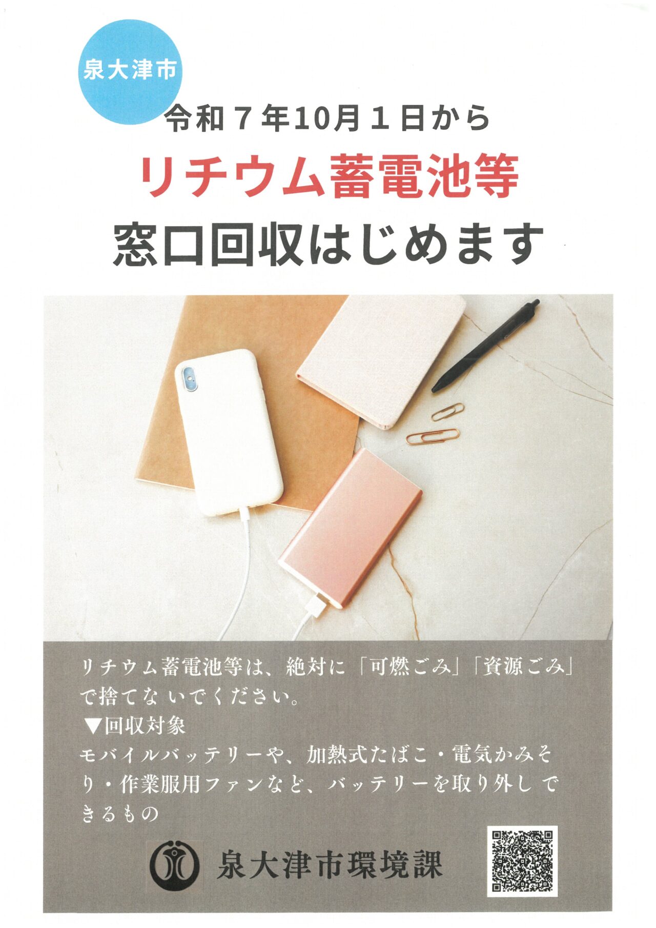 泉大津市では2025年10月1日から、家庭で不要となったリチウム蓄電池等を、環境課の窓口で回収が開始されました。