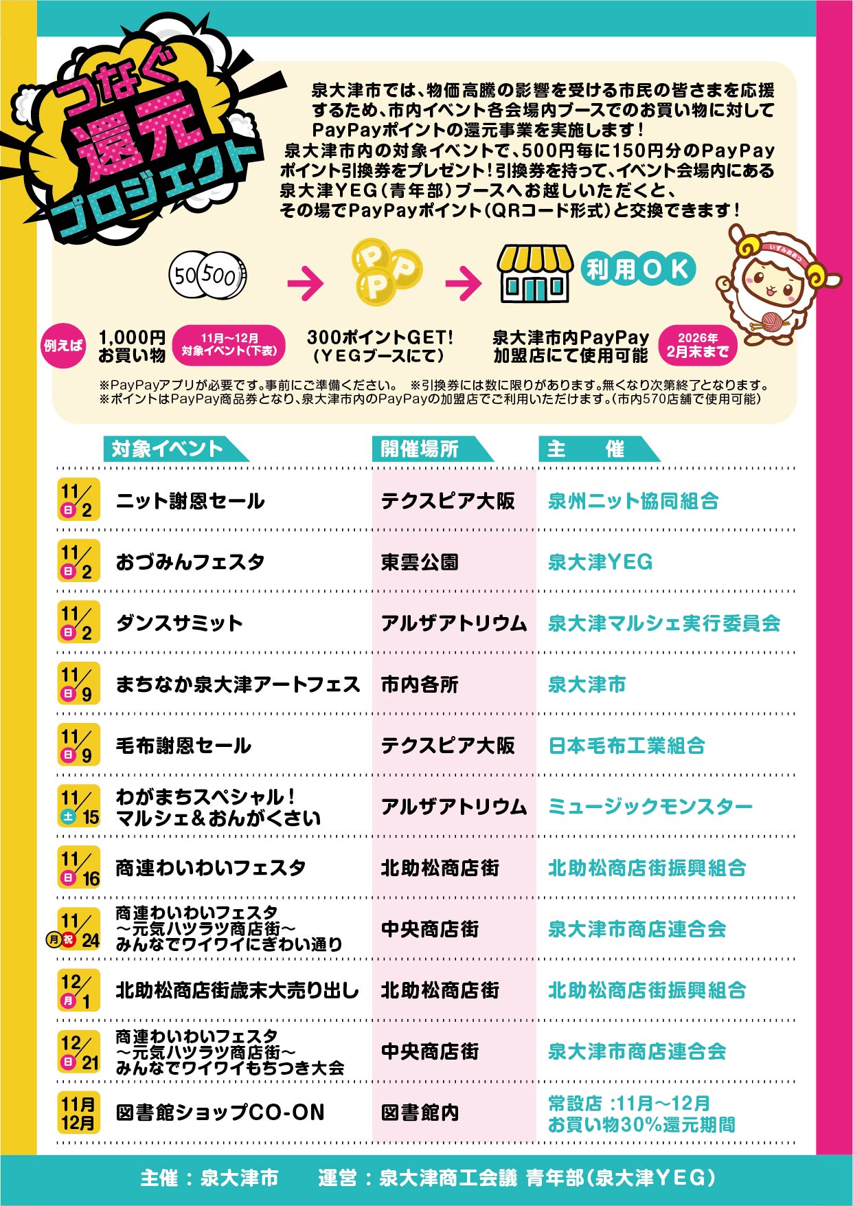 泉大津市では、物価高騰の影響を受ける市民の皆さまを応援するため、市内イベント各会場内ブースでのお買い物に対してPayPayポイントの還元事業を実施します。