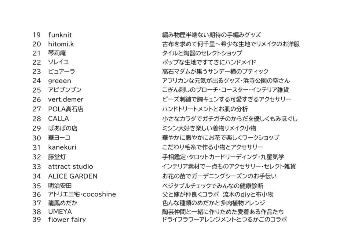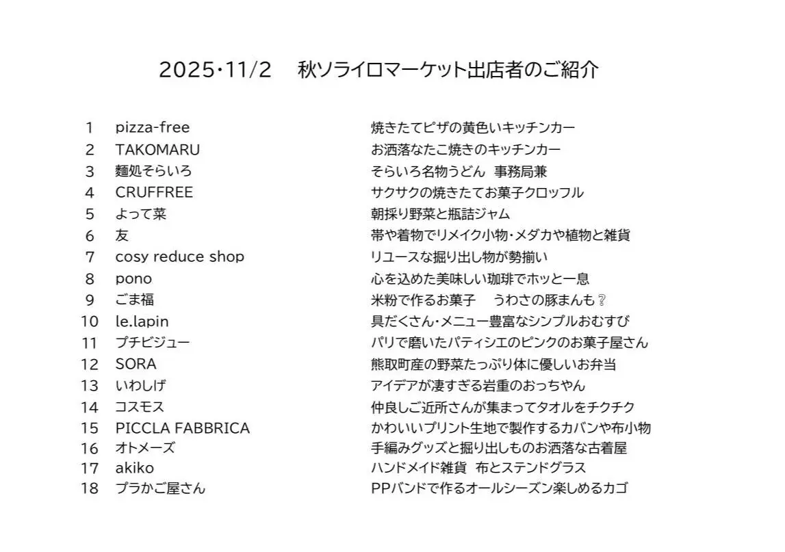 キッチンカーやブースでの飲食系や物販はもちろん、ワークショップ、マッサージ、占い、植物系、木工、DIY、ハンドメイドやフリマなど多種多様の出店です。以前からの懐かしいお店や新たなお店など楽しむことができるようです。