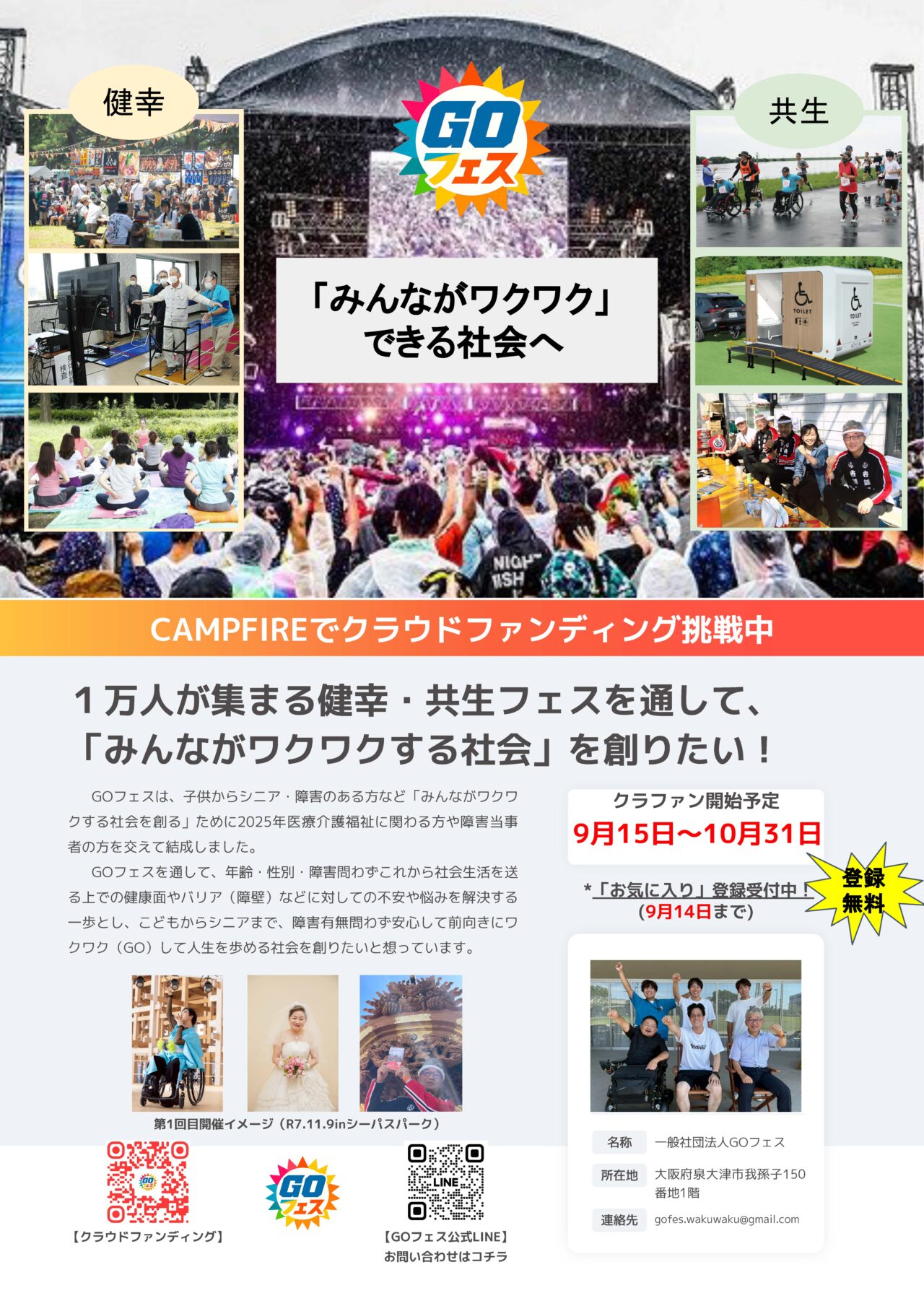 一般社団法人GOフェスのSNSによりますと、「GOフェスは子供からシニア、障害のある方など「みんながワクワクする社会を創る」ために令和7年6月に医療・介護・福祉に関わる方や障害当事者の方を交えて一般社団法人GOフェスを結成し、GOフェス開催に向けて動き始めました!私達はフェスやイベント、普及啓発活動を通して、年齢・性別・障害問わず、これから社会生活を送る上で、健康面やバリア(障壁)に対して不安や悩みを持つ方々に、GOフェスを通じて解決する!を第一歩(スタートアップ)とし、シニアの方や、障害があっても安心して、前向きにワクワク(GO)して人生を歩める社会を創りたいと想っています。