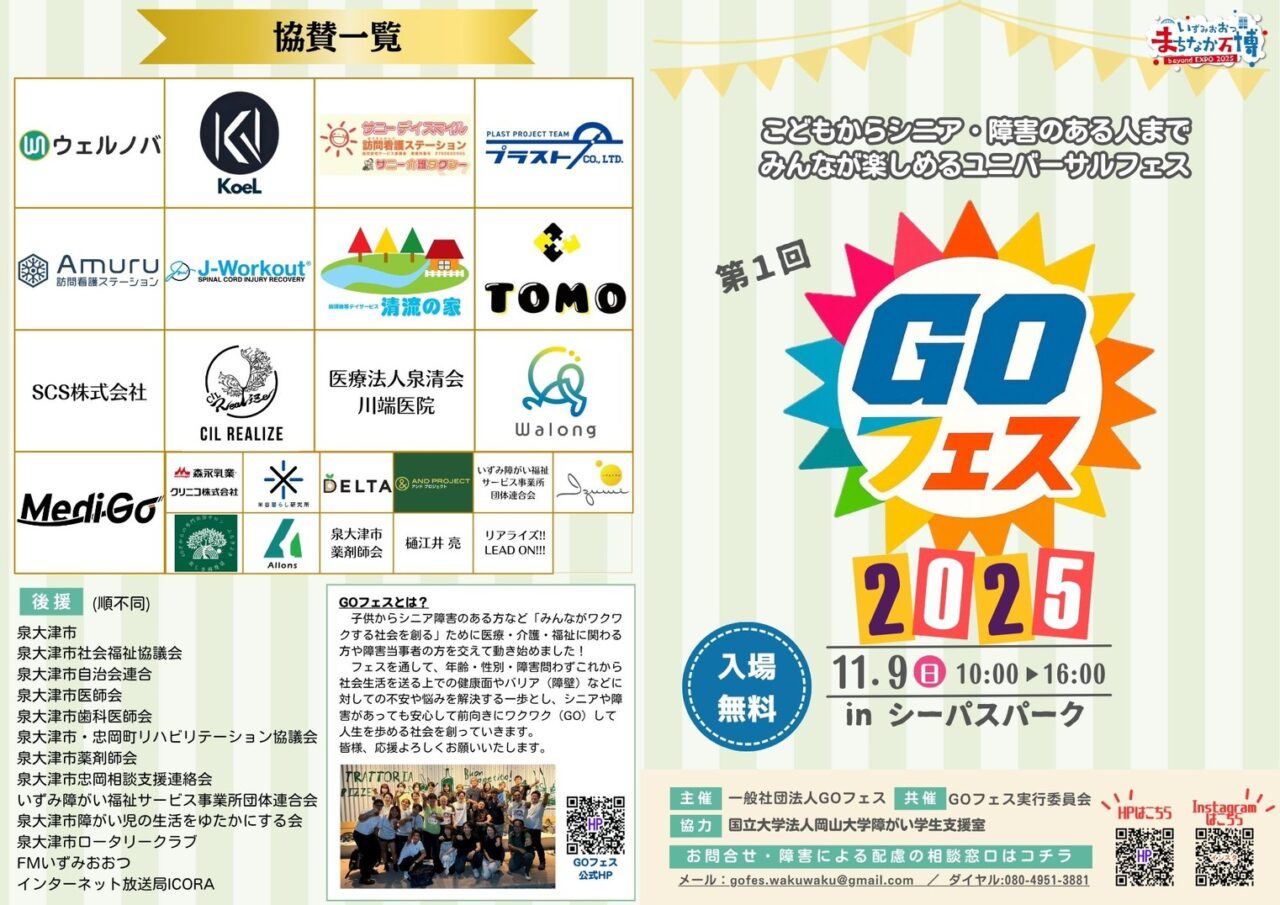 2025年11月9日(日曜日)10時から16時までこどもからシニア・障害のある人までみんなが楽しめるユニバーサルフェス「GOフェス2025」が泉大津シーパスパークで開催されます。