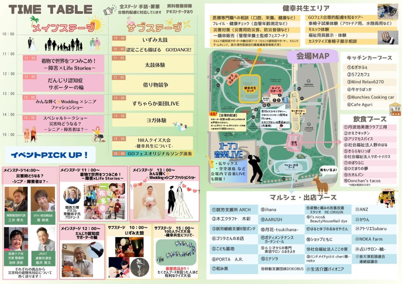メインステージでは着物ファッションショー・シニアウエディングショー・シンポジウム「災害時にシニア・障がい者はどうなる?」・だんじり認知症サポーターの輪などを始め、サブステージでは、いずみ太鼓・太鼓体験・認定こども園の園児発表・借り物競走・すちゃらか楽団LIVE・ヨガ体験が予定されています。