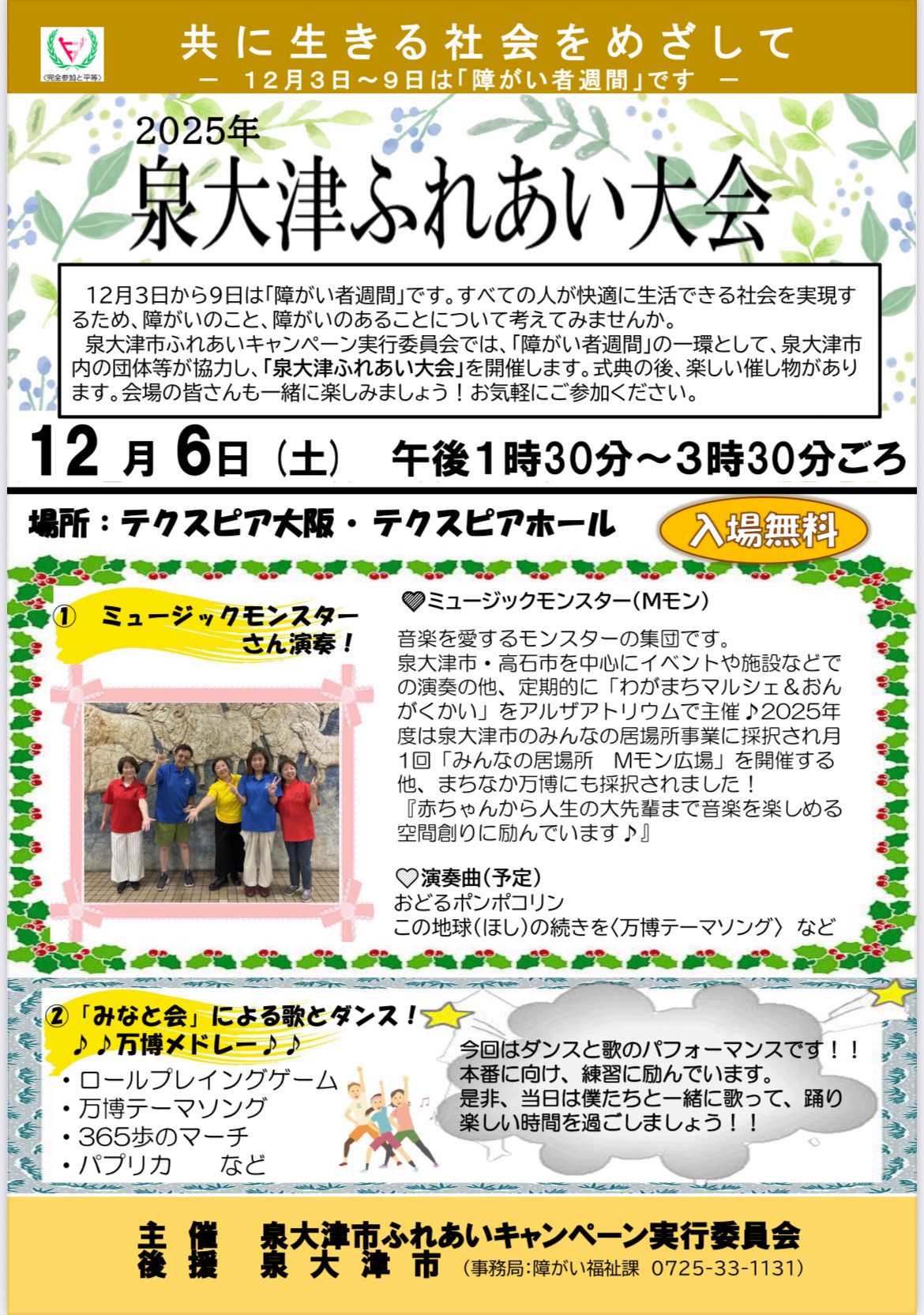 2025年12月6日(土曜日)13時半から15時半頃までテクスピア大阪大ホールで「泉大津ふれあい大会」が開催されます。