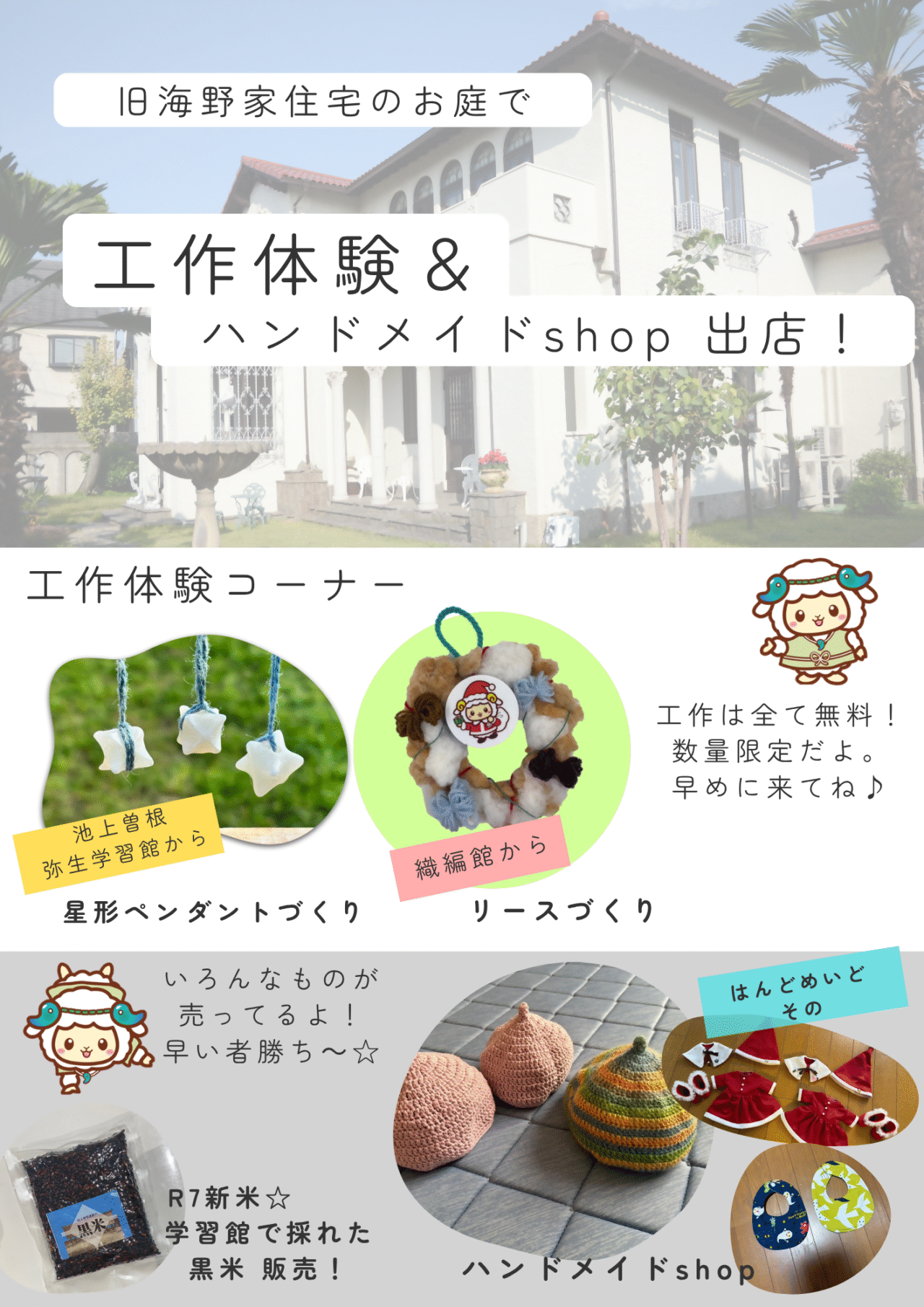 さらに! 敷地内庭園では、リースづくりやペンダントづくりなどの工作体験(無料)をはじめ、可愛いハンドメイドショップを出店いたします。