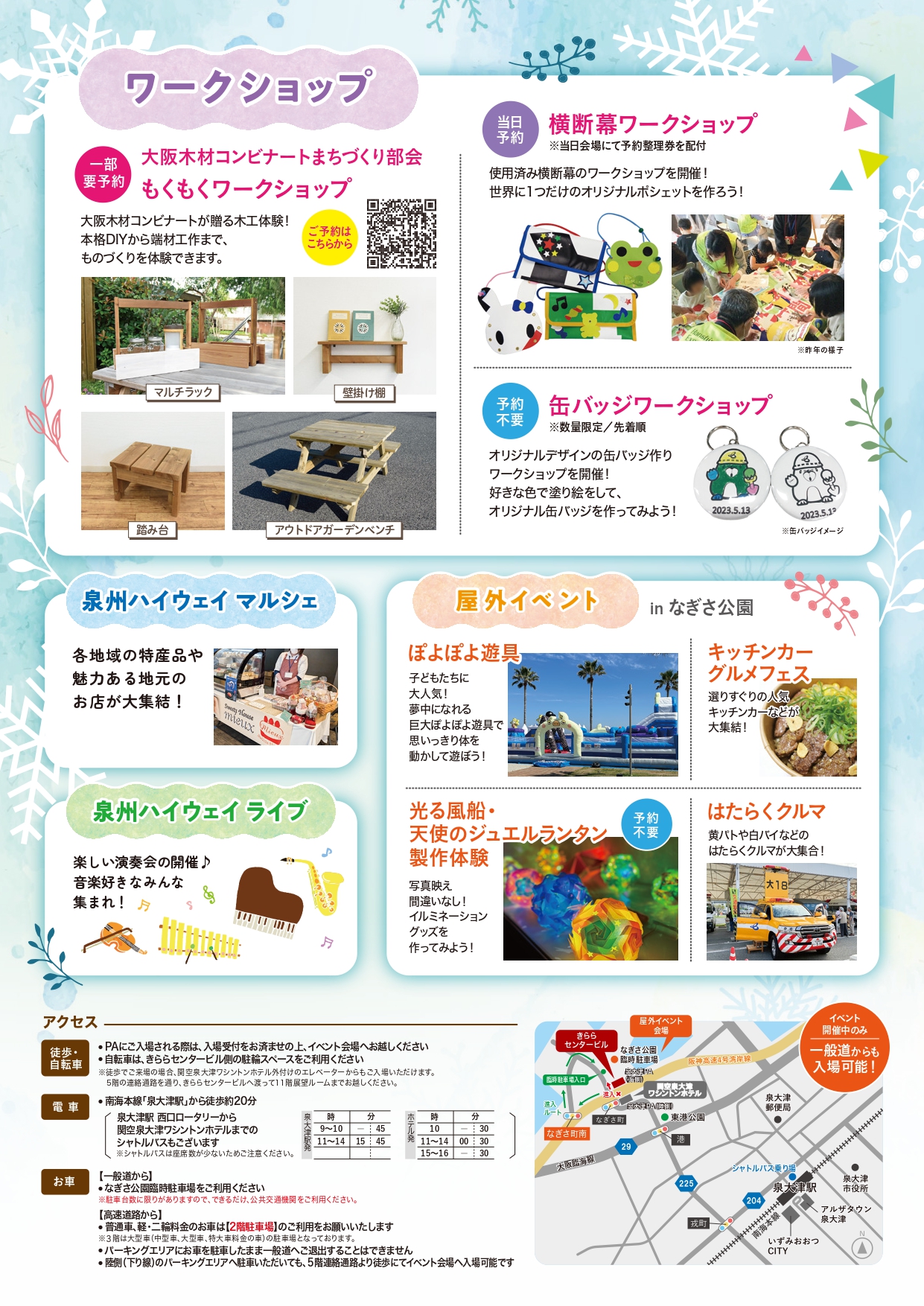 高石・泉大津・忠岡の外、岸和田・貝塚・泉佐野の魅力あるスイーツ店等が参加する「泉州ハイウェイマルシェ」のほか、学生や子どもたちによる本格的な演奏を楽しめる「泉州ハイウェイライブ」も初開催となります。さらに、今年から初めて屋外会場もご用意し、お子さまに人気の「ぽよぽよ遊具(エアー遊具)」や「こども免許証づくり体験」、また温かいお料理を提供するキッチンカーも参加するなど、 たくさんのお客さまに楽しんでいただける内容になっています!