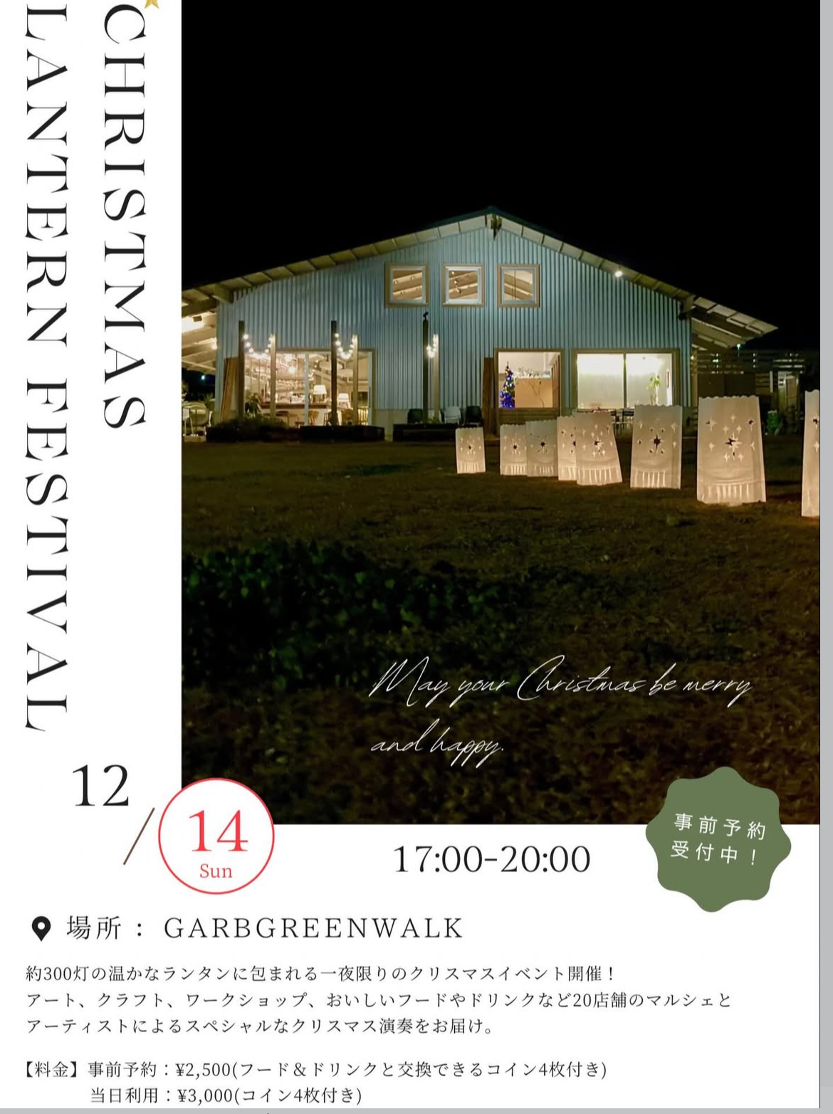 2025年12月14日(日曜日)17時から20時迄シーパスパーク内のレストランGARB GREEN WALKでCHRISTMAS LANTERN FESTIVALが開催されます!