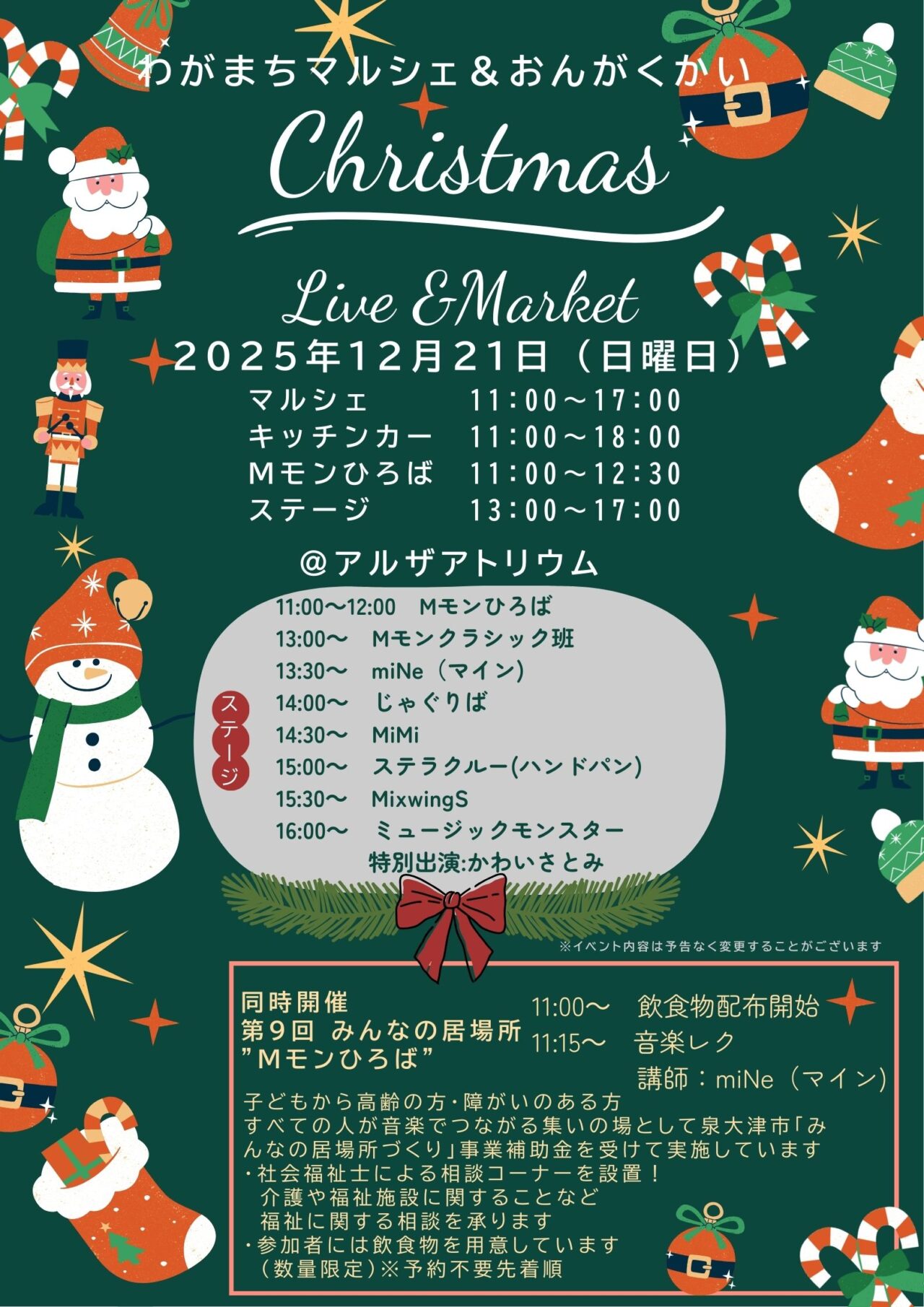 2025年12月21日(日曜日) 11時から17時まで (キッチンカーは18時まで)泉大津駅近くアルザアトリウムで~泉大津を楽しもう~わがまちマルシェ&おんがくかい クリスマスライブ&マーケットが開催されます。