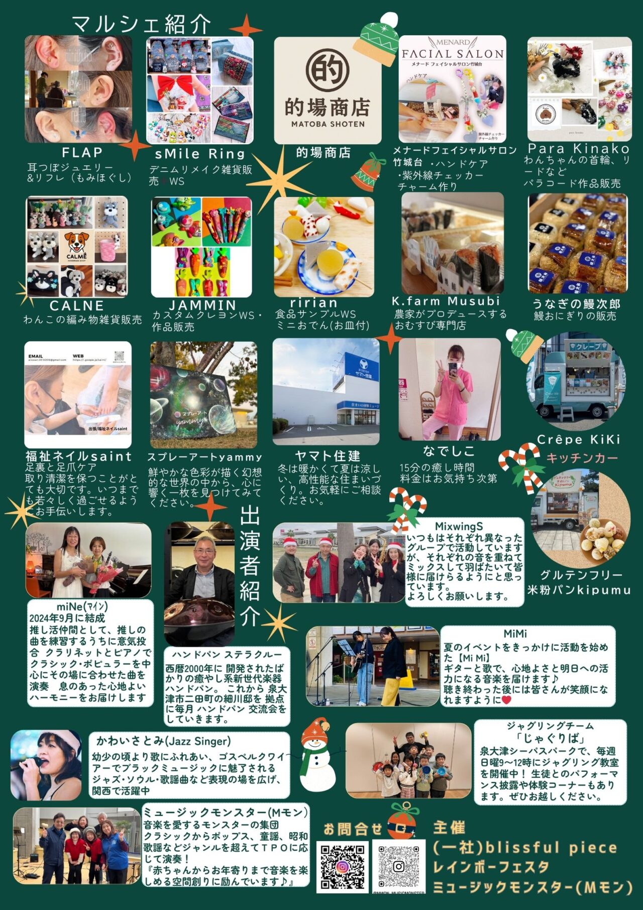 sMile Ring、なでしこ、FLAP、メナード、Para Kinako始め、わがまちマルシェ初出店のCALNE、JAMMIN、ririan、福祉ネイルsaint、スプレーアートyammy、ヤマト住建が出店予定です。