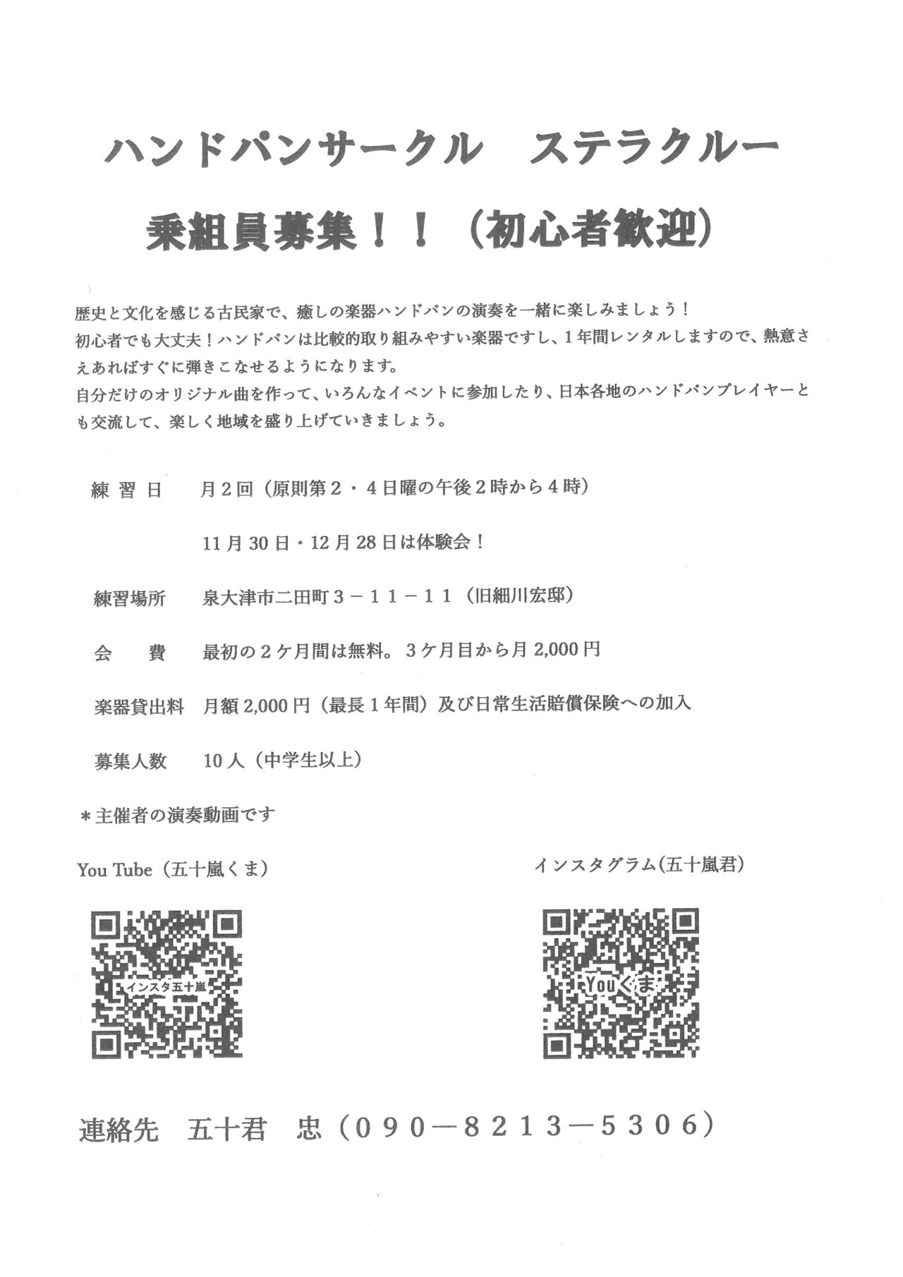 11月23日の「まちなかストリートライブ」でハンドパンという楽器演奏をされた五十嵐さんが、泉大津市二田町の古民家でハンドパンサークルのステラ★クルーを2026年から立ち上げるに先立ち、着々と準備が始まっています。