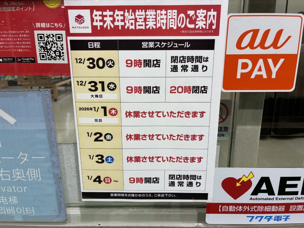 12月31日(水曜日)10時から18時、1月1日(元日)休業、2日(金曜日)10時から19時にそれぞれ変更。