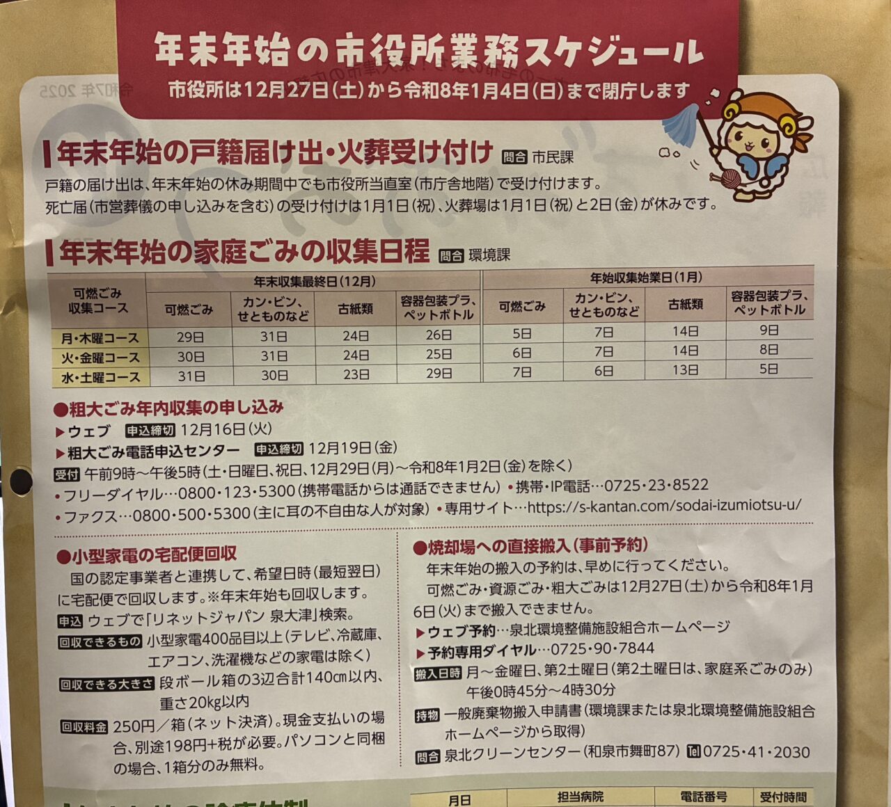 2025年、年末年始の家庭ごみの収集日程が広報いずみおおつ12月号P2やHPに掲載されています。