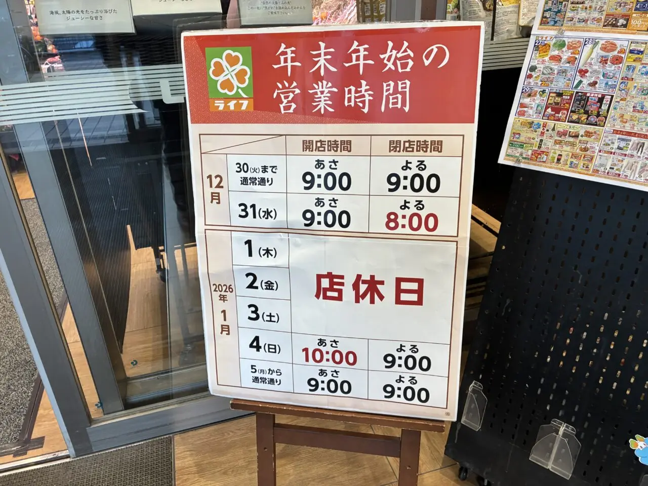 ライフ高石店は、12月31日が9時から20時、1月1日から3日までお休み、1月4日は10時から21時の営業となります。