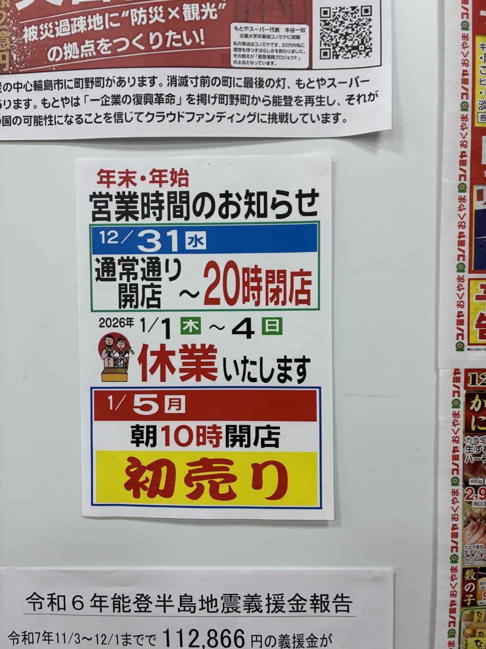 業務スーパー高石綾園店、羽衣店は、12月31日が9時から19時迄営業、1月1日から3日までお休みとなります。