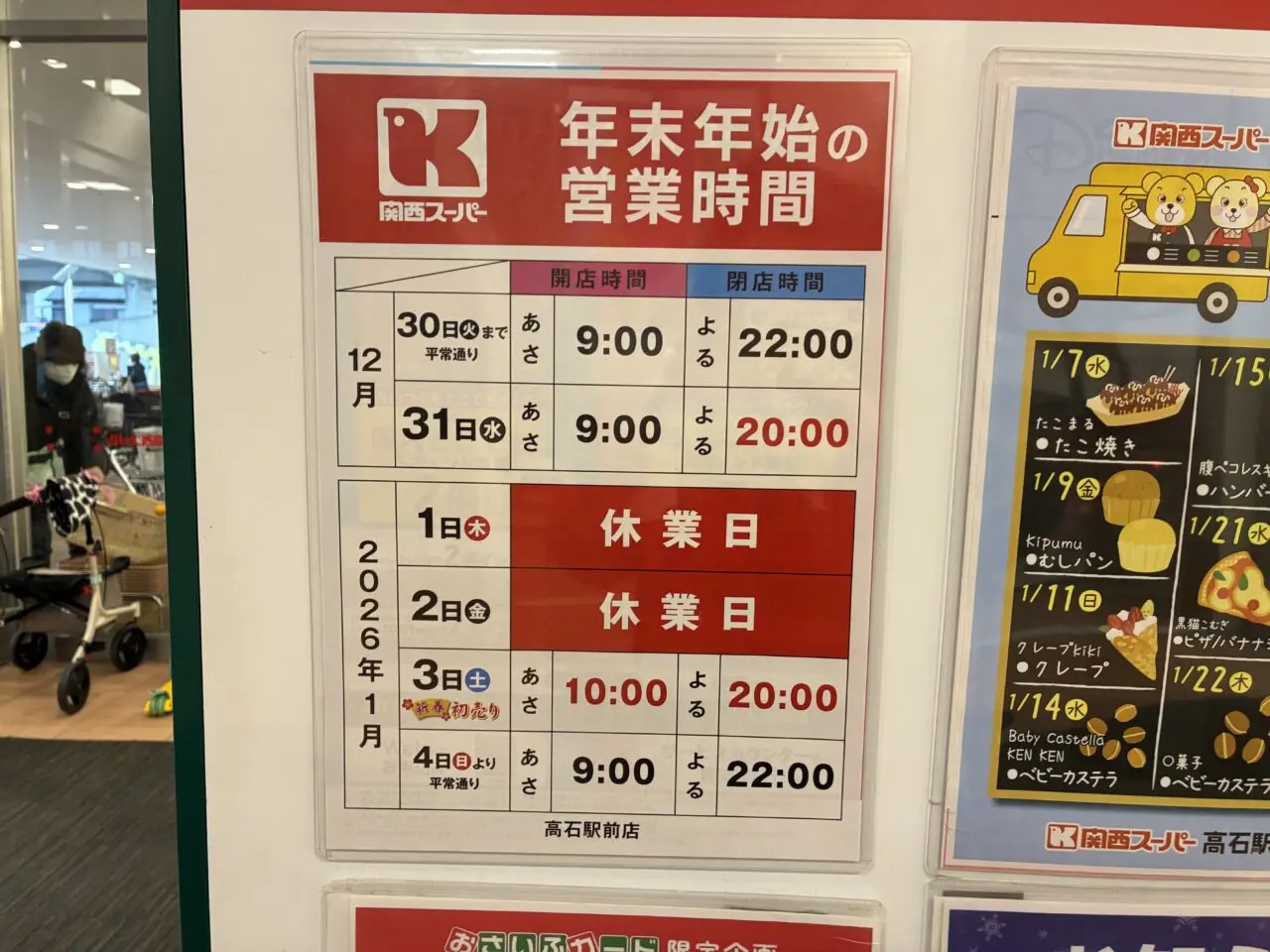 関西スーパー 高石駅前店は12月31日が9時から20時まで、1月1日・2日はお休み・1月3日は10時から20時の営業となります。