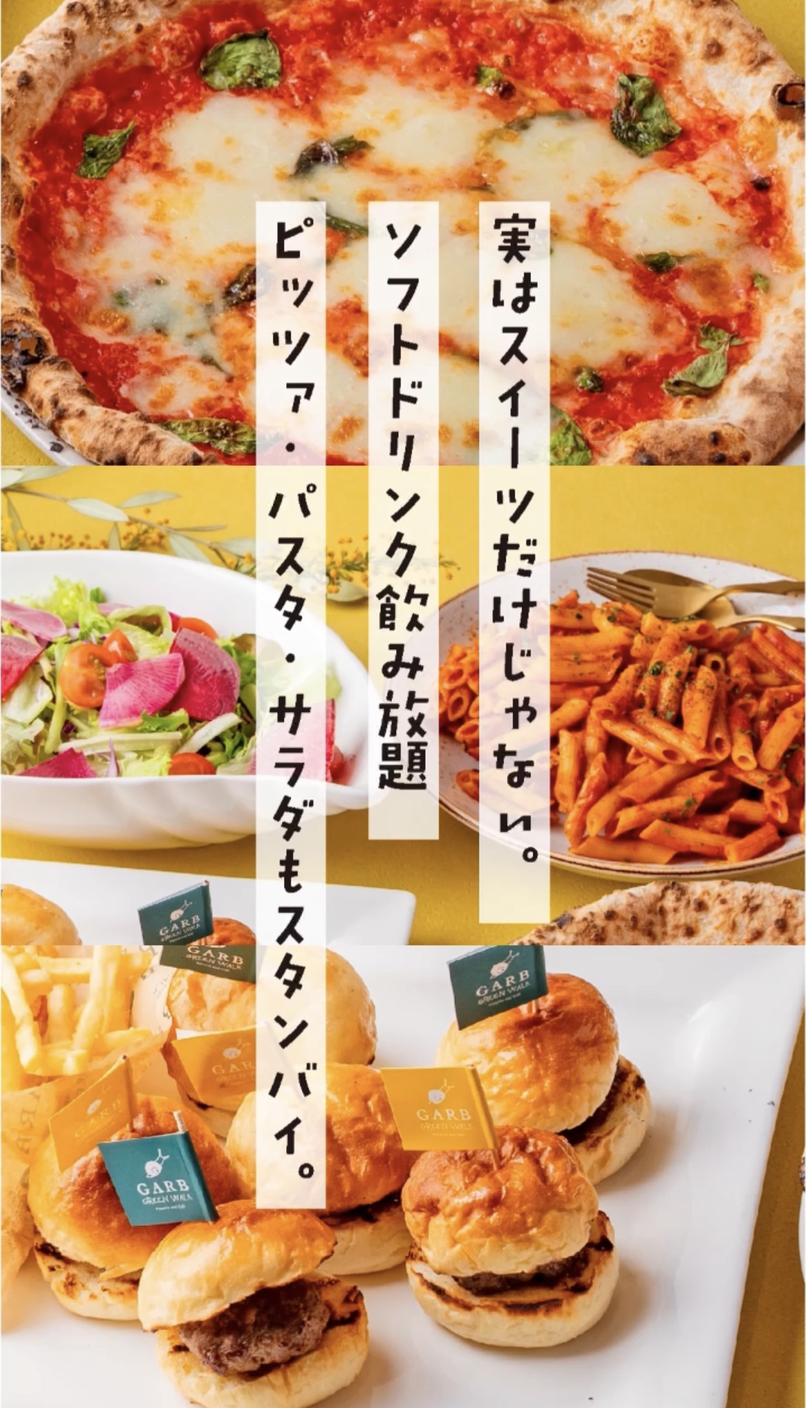 しかも盛りだくさんのスイーツだけでなく、GREEN WALK自慢のピッツァや彩り豊かなサラダ、パスタやポテト、ソフトドリンクも飲み放題!!