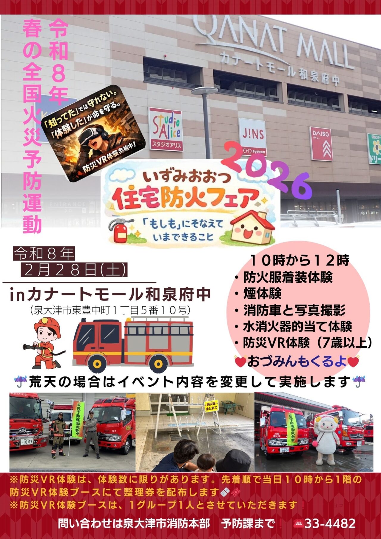 2026年2月28日(土曜日)10時~12時にカナートモール和泉府中の平面駐車場(ユニクロ側)と1階食品側催事場て「いずみおおつ住宅防火フェア2026 『もしも』にそなえていまできること」が開催されます!