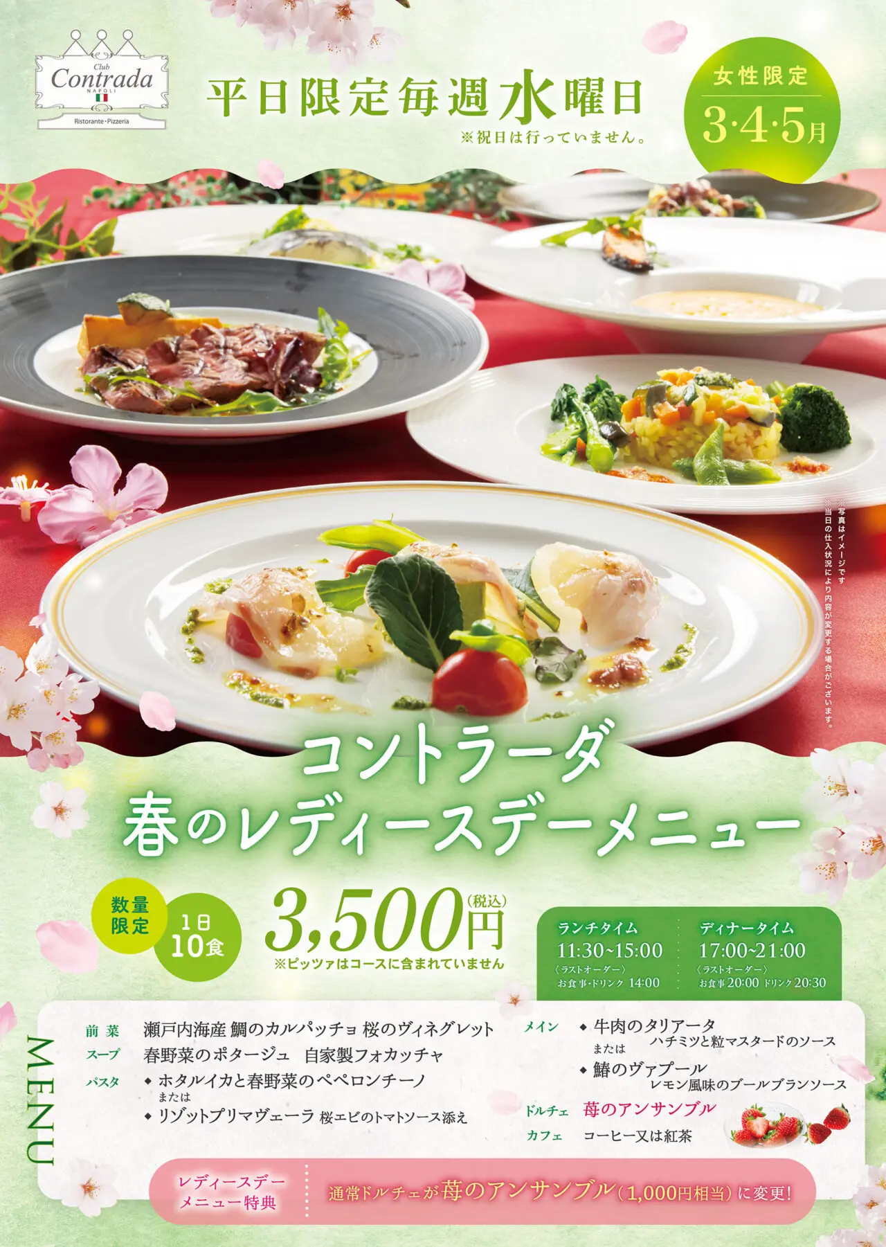 また、3月〜5月の水曜日は女性限定でお得なコース料理を提供!