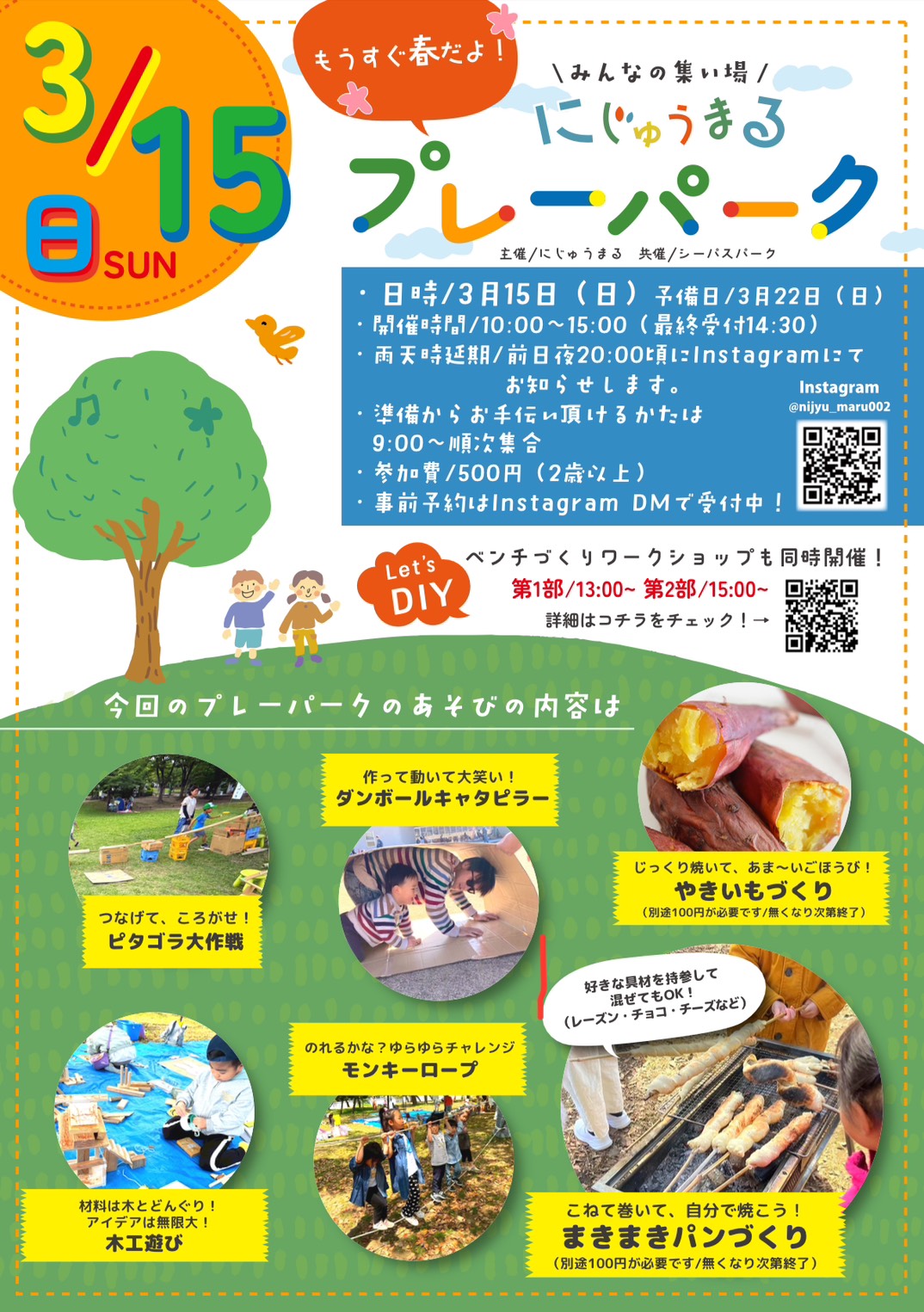 2026年3月15日(日曜日)10:00〜15:00(受付14:30迄)ファミリーサークルにじゅうまる主催シーパスパーク共催による「もうすぐ春だよ!プレーパーク!」がシーパスパークで開催されます!