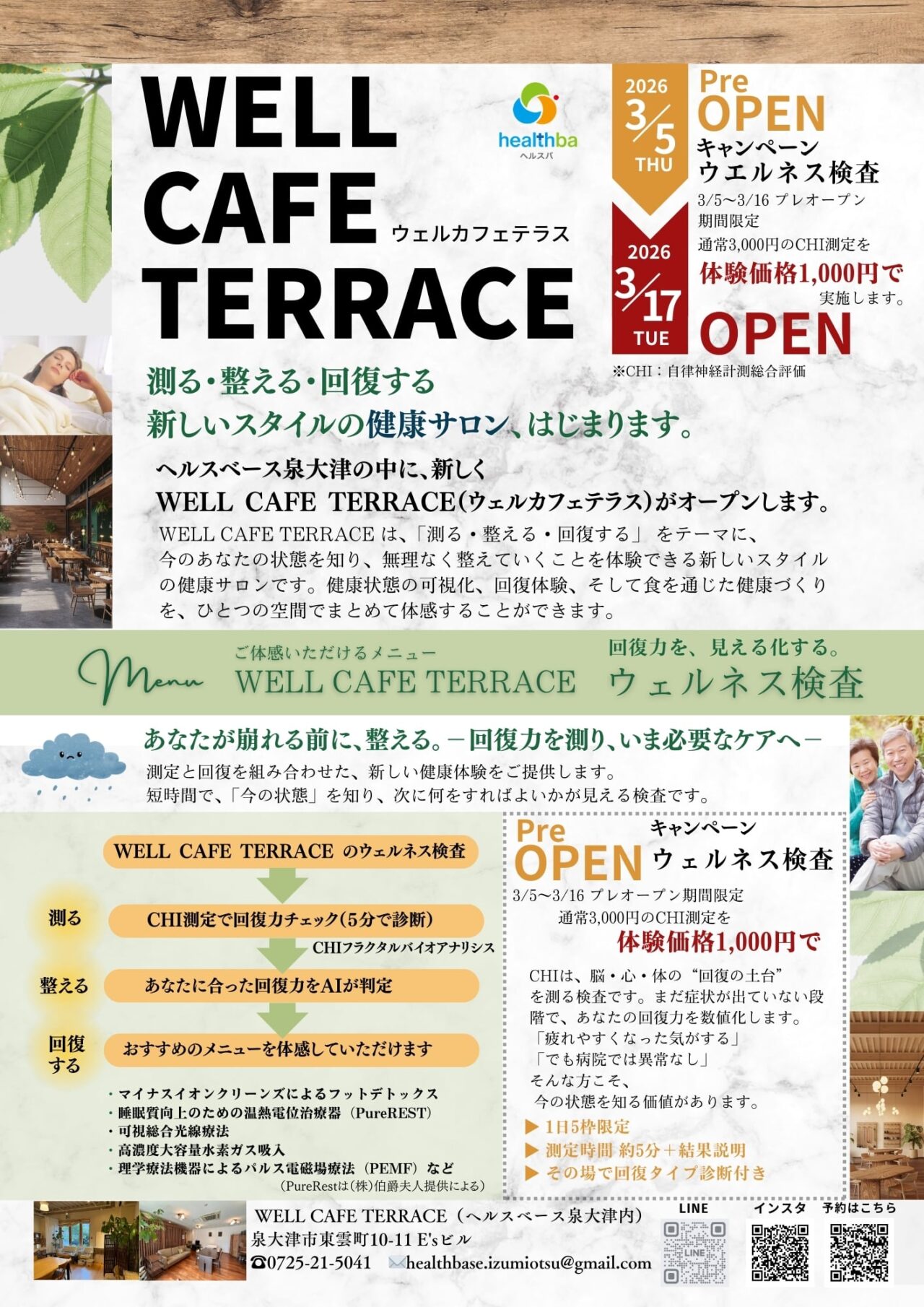 【泉大津市】3/17ヘルスベース内に新しいウェルネスサロン「WELL CAFE TERRACE」がオープンするようです!