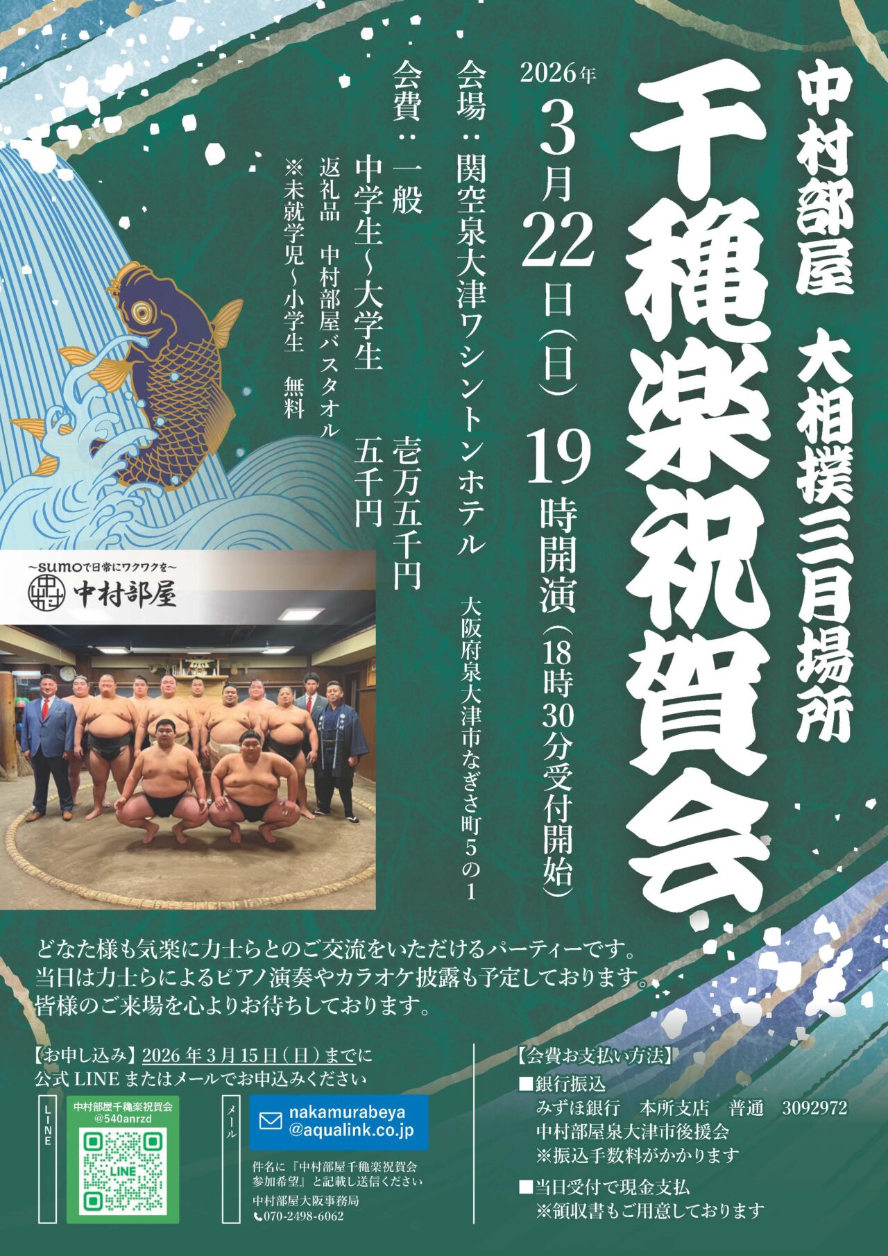 そんな中村部屋の力士たちの15日間の奮闘を締めくくる、「千穐楽祝賀会」の情報が入ってきました!