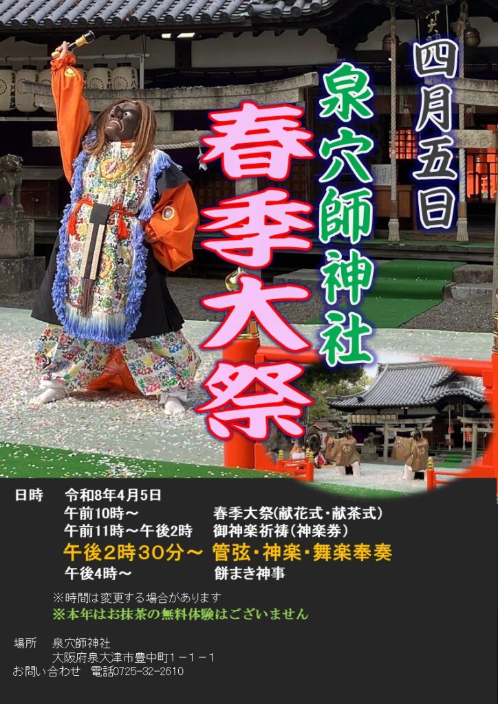 2026年4月5日(日曜日) 泉穴師神社で令和8年春季大祭(春祭)が開催されます。
