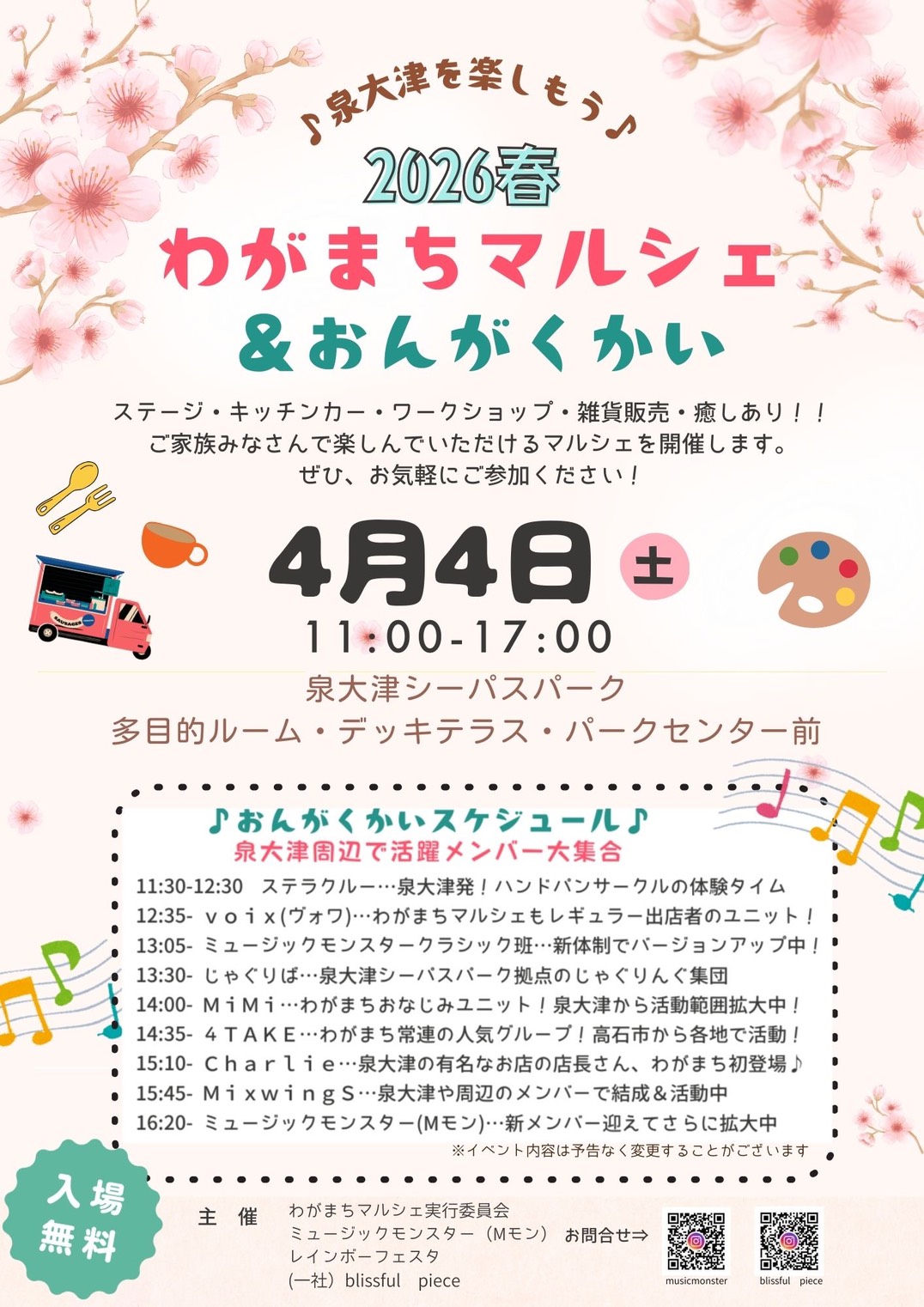 【泉大津市】4/1わがまちマルシェ&おんがくかいがシーパスパークで開催されます!