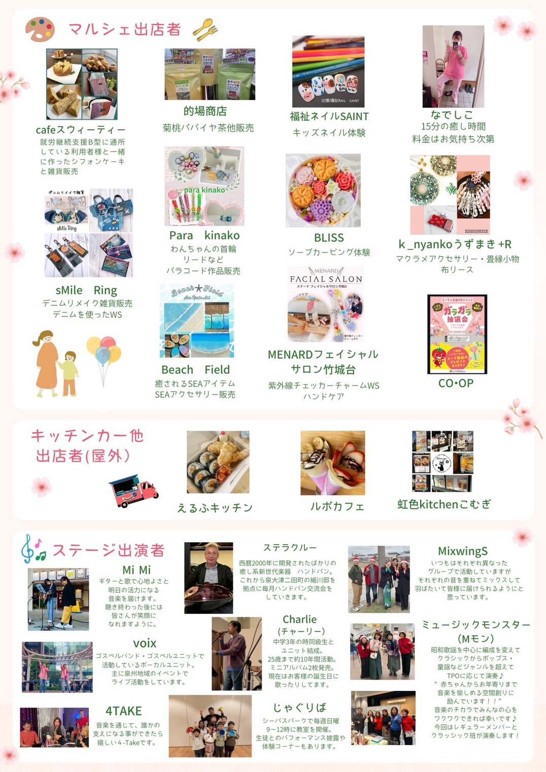 今回のデッキテラスで開催されるステージは泉大津やその周辺をベースとして活躍されているミュージシャンやパフォーマーの方々が勢揃いです。