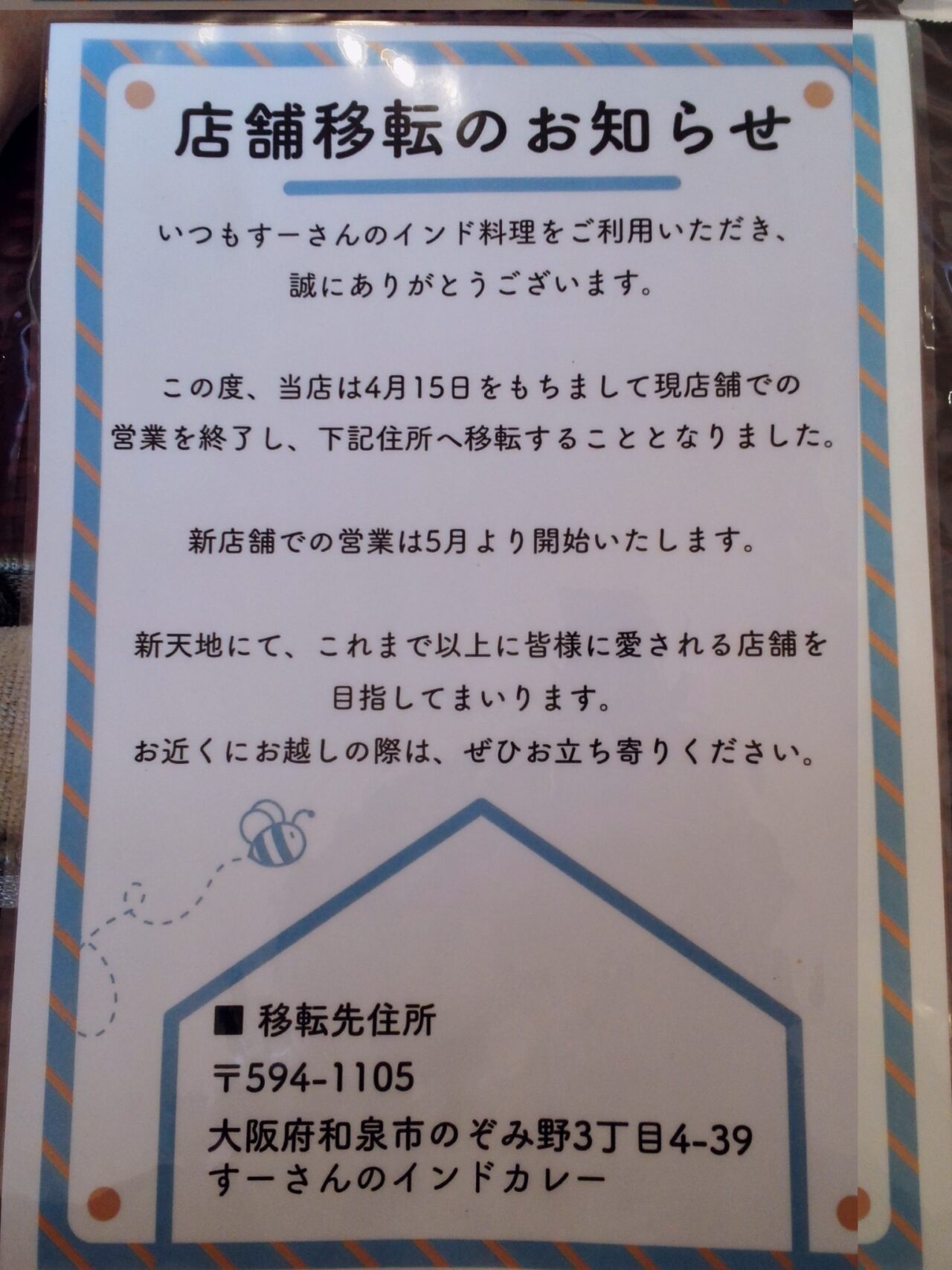 【泉大津市】「すーさんのインド料理」が和泉市に移転されます!