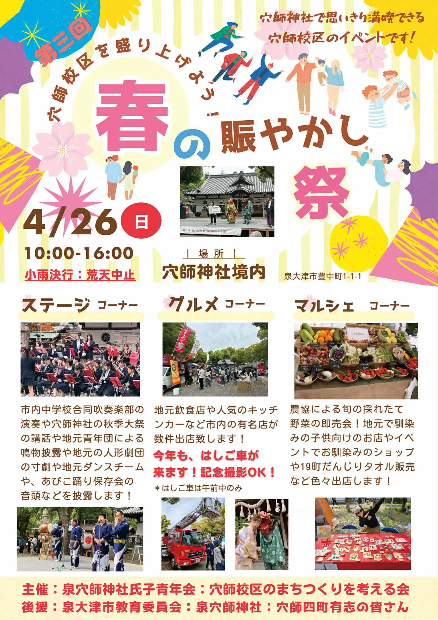 2026年4月26日(日曜日)10時から16時まで泉穴師神社境内で「穴師校区を盛り上げよう!泉穴師神社春の賑やかし祭」が開催されます!