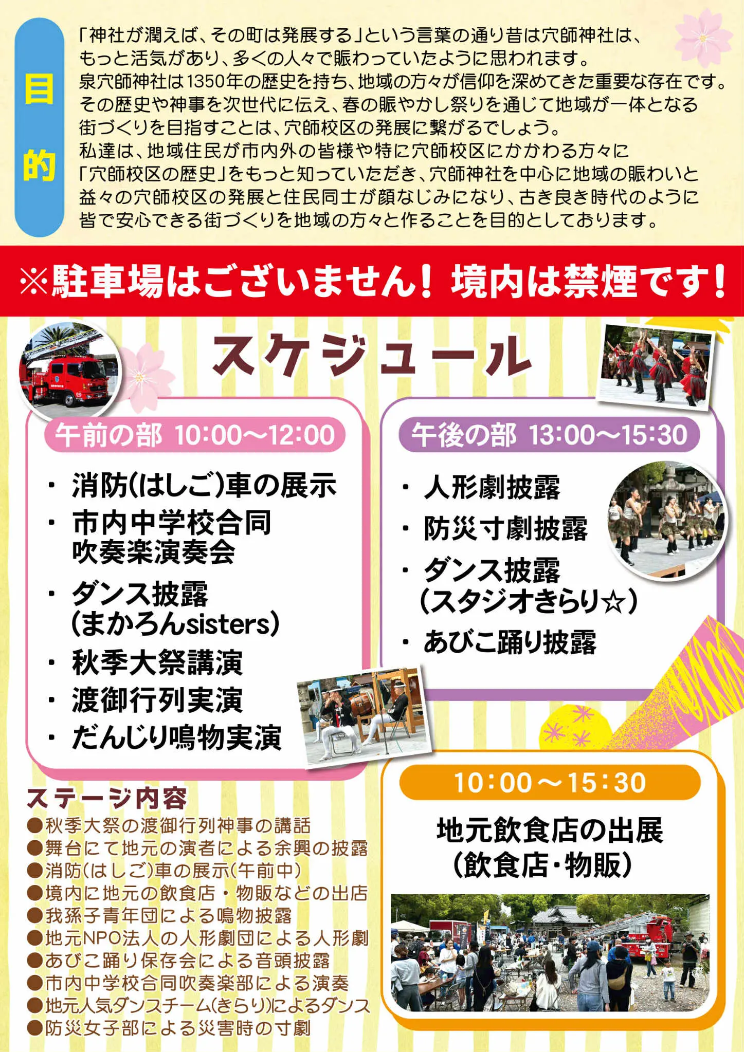 泉穴師神社氏子青年会と穴師校区のまちづくりを考える会の主催による催しで、当日は「ステージコーナー」「グルメコーナー」「マルシェコーナー」に加え、はしご車(午前中のみ)も登場予定の穴師校区で思いきり満喫できる穴師校区のイベントです!