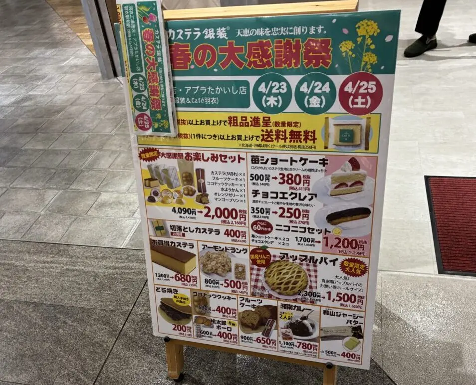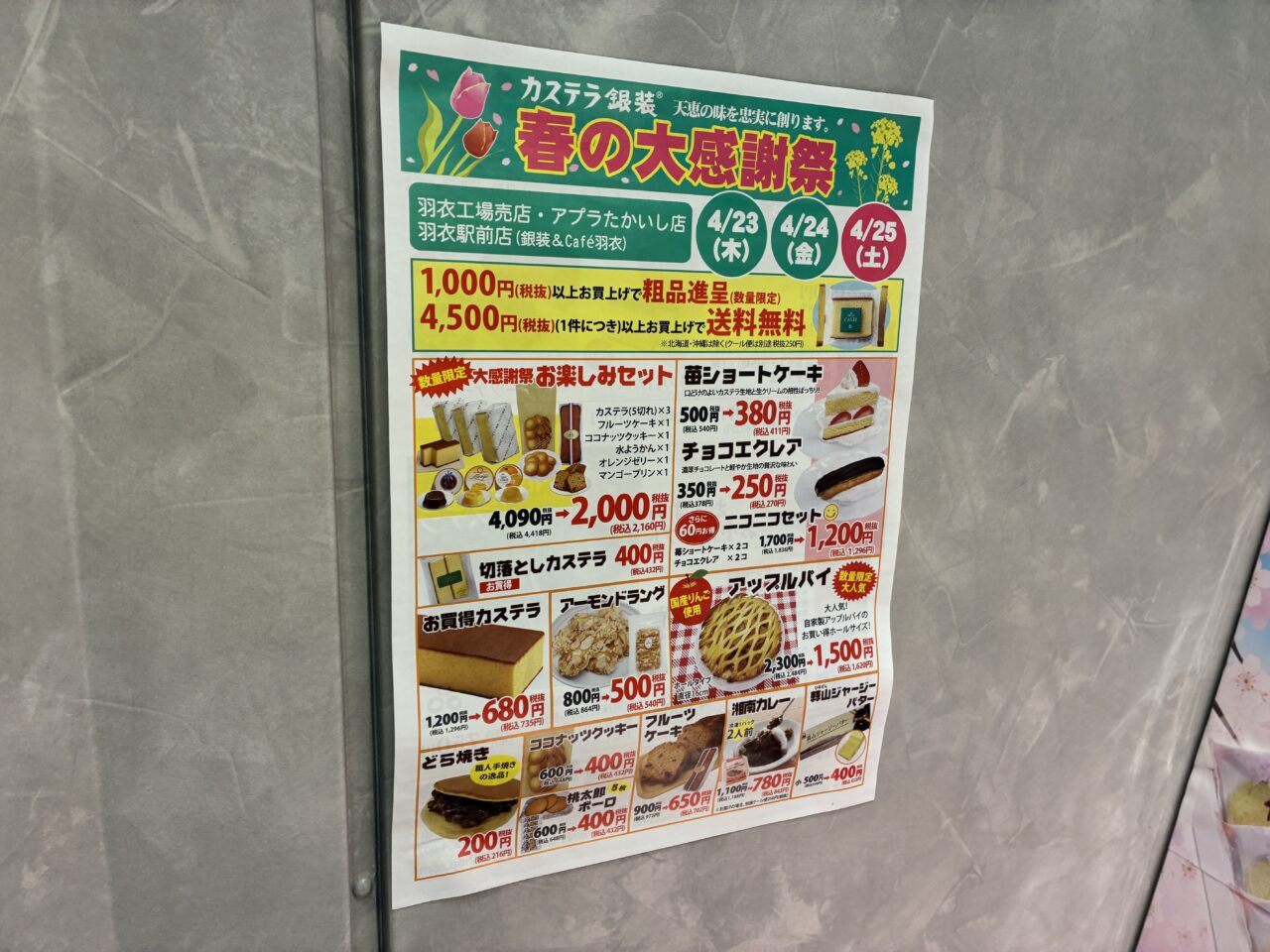 カステラ銀装 羽衣工場売店・アプラたかいし店・羽衣駅前店(銀装&Café羽衣)の3店舗で2026年4月23日(木曜日)・24日(金曜日)・25日(土曜日)の3日間「春の大感謝祭」が開催されます。