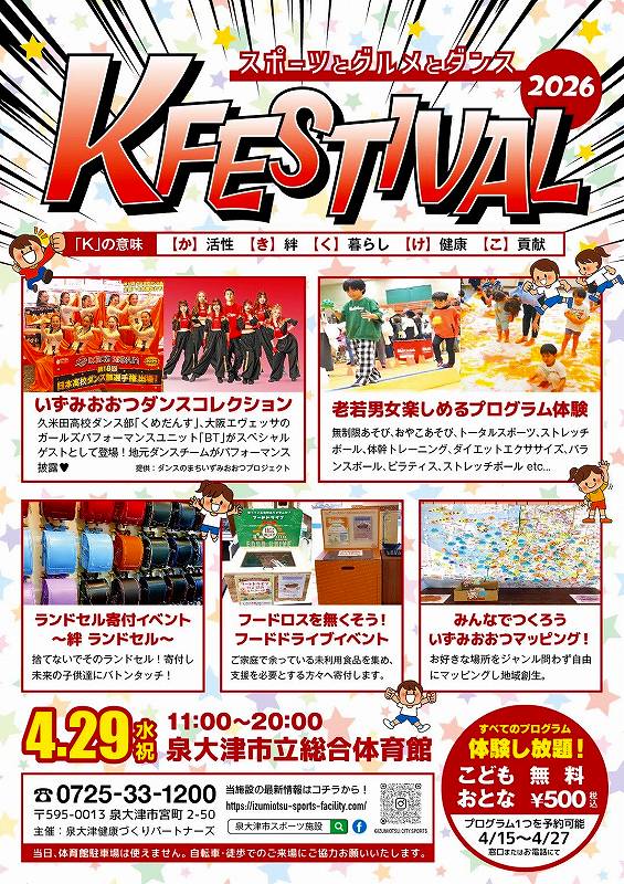 2026年4月29日(水・祝日)11時から20時まで泉大津市立総合体育館にて、スポーツ、グルメ、ダンスを一日中楽しめるビッグイベント「K FESTIVAL 2026」が開催されます!