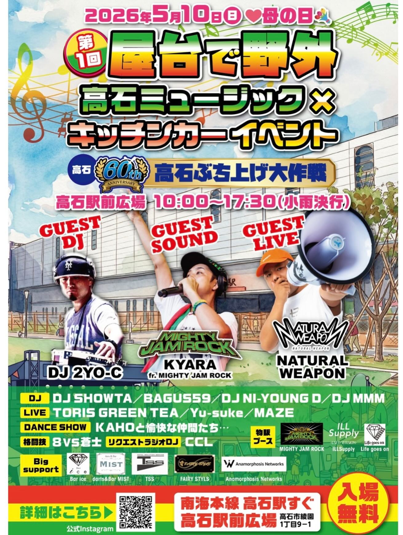 高石ミュージック×キッチンカーの夢のコラボレーション。高石市の市制施行60周年を記念し、街をさらに盛り上げるべく企画されたビッグイベントとなっています。