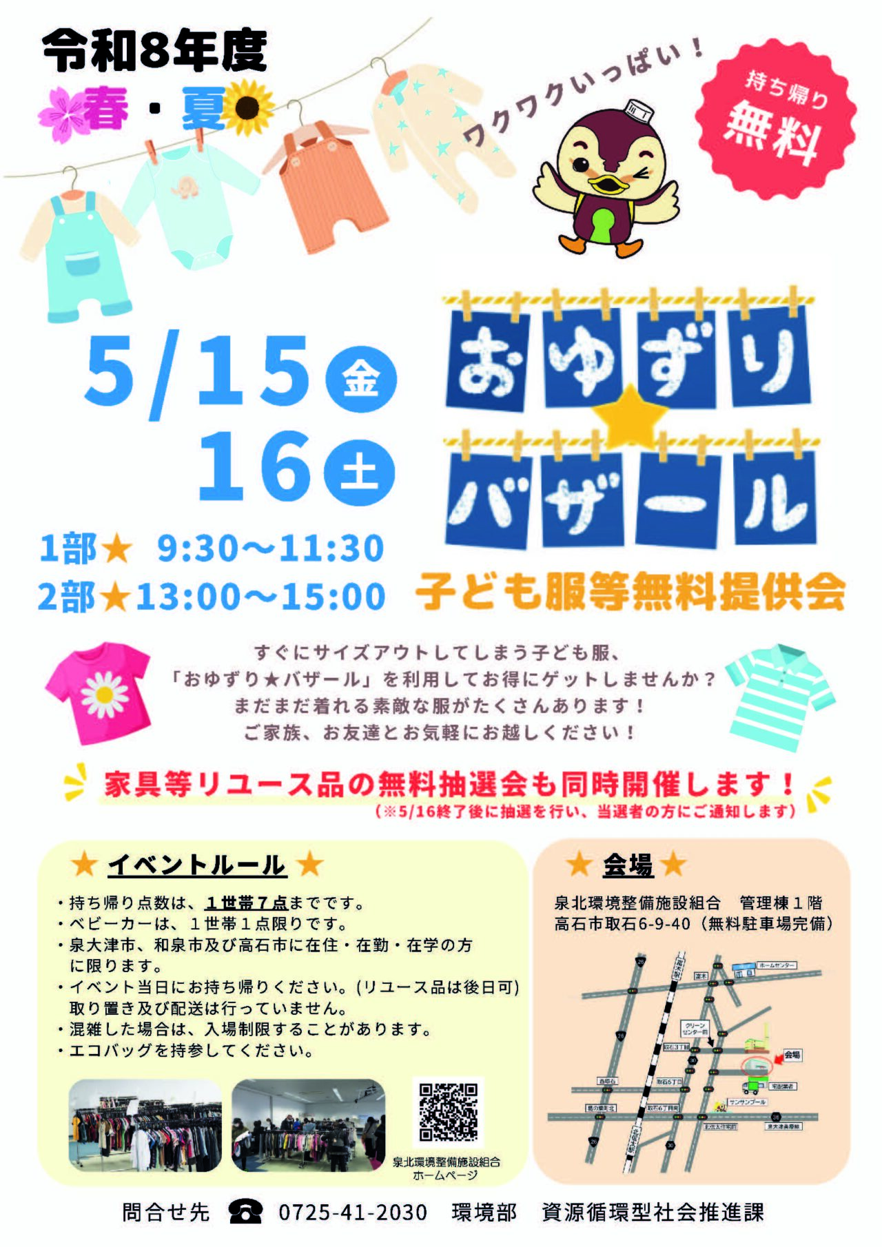 2026年5月15日(金曜日)・16日(土曜日)に泉北クリーンセンターの泉北環境整備施設組合 管理棟1階でおゆずりバザール(子供服等無料提供会)が開催されます。両日とも第1部 9時30分から11時30分まで・第2部 13時00分から15時00分までとなります。