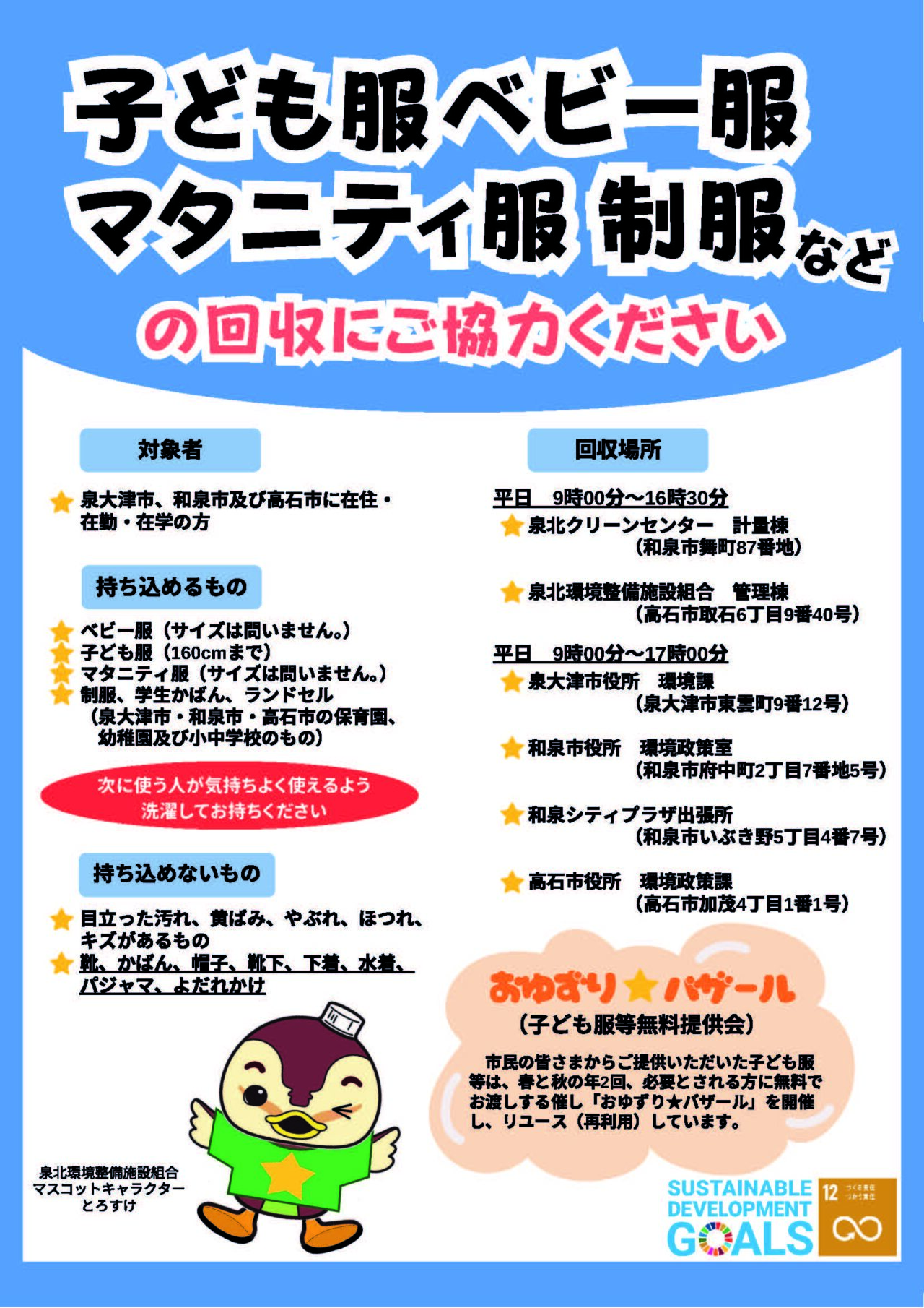泉大津市のHPによりますと、泉北クリーンセンターでは、さらなるごみの減量・再資源化の推進のため、市民の皆さまからご提供いただいた子ども服等を、希望者の方に無料で提供する「おゆずり★バザール(子ども服無料提供会)」を開催されます。